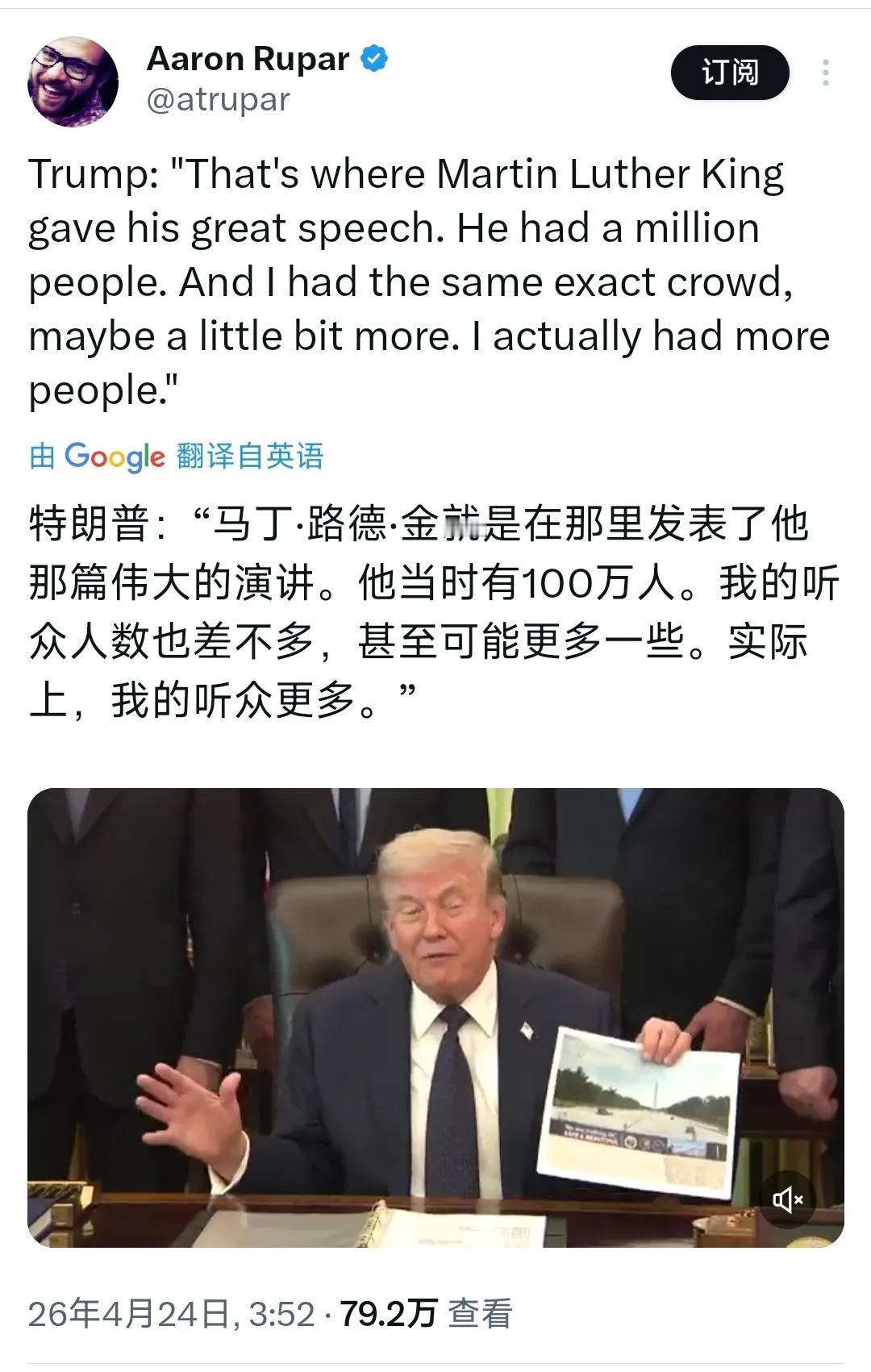 特朗普今天(4月24日)接受采访时表示:“马丁.路德.金就是在那里发表了他那篇伟大的演讲。他当时有100万人。我的听众人数也差不多,甚至可能更多一些。实际上,我的听众更多。” 马丁.路德.金是美国著名的黑人民权领袖,1964年诺贝尔和平奖获得者。他为争取黑人在美国社会中的平等地位贡献了毕生精力,赢得了美国和世界人民的尊敬。特朗普今天自称比马丁.路德.金还要伟大。不过美国数据平台lnfogram发布统计报告称,特朗普在任总统期间发表了55654条虚假声明,平均每天近98条谎言。