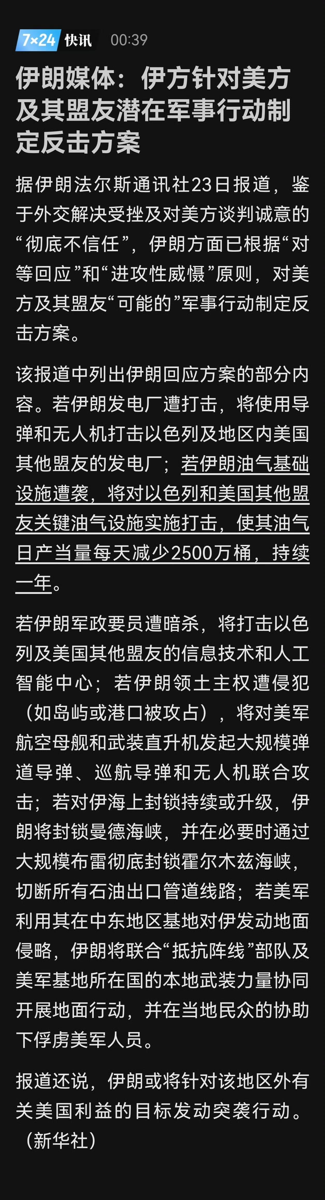 这两条消息连在一起,就是伊朗对外释放的强硬信号:谈判的大门正在被革命卫队主导的"对等报复方案”关上,中东局势的火药味瞬间拉满。 一、两条消息的核心逻辑:谈判路线彻底被“强硬派”接管 1.卡利巴夫退出谈判:外交路线宣告失败 原本负责对美谈判的议长卡利巴夫,是伊朗温和派的代表,他一直主张通过外交渠道解决争端。但革命卫队介入后,他直接退出谈判团队,意味着温和派主导的外交路线彻底失势,谈判的主导权完全落到了革命卫队的强硬派手中。 市场第一时间就反应了:美股下跌、原油暴涨,因为市场知道,谈判这条路已经基本走不通了,冲突升级的概率大幅上升。 2.“对等报复方案”公布:把红线直接划到了美国及其盟友脸上 这份方案不是虚张声势,而是分场景、分目标的精确反击清单,每一条都直击美国和盟友的要害: 你炸我的发电厂,我就炸以色列和你盟友的发电厂; 你打我的油气设施,我就让你盟友的油气产量每天少2500万桶,持续一年; 你暗杀我的军政要员,我就端掉你的AI 和信息技术中心; 你封锁我的海上通道,我就布雷封死霍尔木兹海峡,切断全球石油生命线; 你在中东搞地面入侵,我就拉着整个“抵抗之孤”一起打,甚至直接俘虏美军人员。 二、这两件事连在一起,意味着什么? 1.伊朗内部已经完成“路线切换” 革命卫队接管主导权,意味着伊朗已经放弃了对美谈判的幻想,不再相信外交能解决问题,转而全面采用“以打促谈、以威慑止战”的强硬策略。 2.美国及其盟友的压力瞬间拉满 之前美国一直以为,只要用极限施压就能逼伊朗回到谈判桌,但现在伊朗直接把反击方案摊牌了,而且是能直接冲击全球能源市场的那种--霍尔木兹海峡一封,油价直接起飞,美国经济根本扛不住。 3.冲突升级的风险直线上升 之前双方还留着谈判的余地,现在谈判负责人退出、反击方案公开,相当于把最后一层窗户纸捅破了。接下来任何一次误判、 任何一次擦枪走火,都可能直接触发伊朗的反击预案,把整个中东拖入全面冲突。