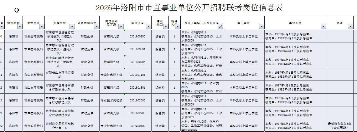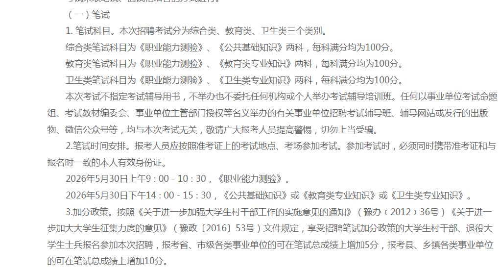 2026年河南省洛阳事业单位公开招聘208人!报名时间为2026年4月24日9∶00至4月30日17∶00。笔试时间:2026年5月30日上午9∶00-10∶30,《职业能力测验》。2026年5月30日下午14∶00-15∶30,《公共基础知识》或《教育类专业知识》或《卫生类专业知识》。