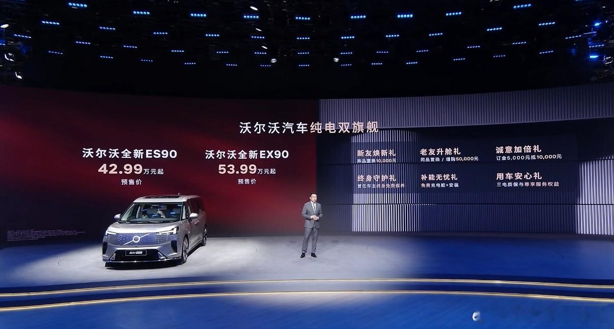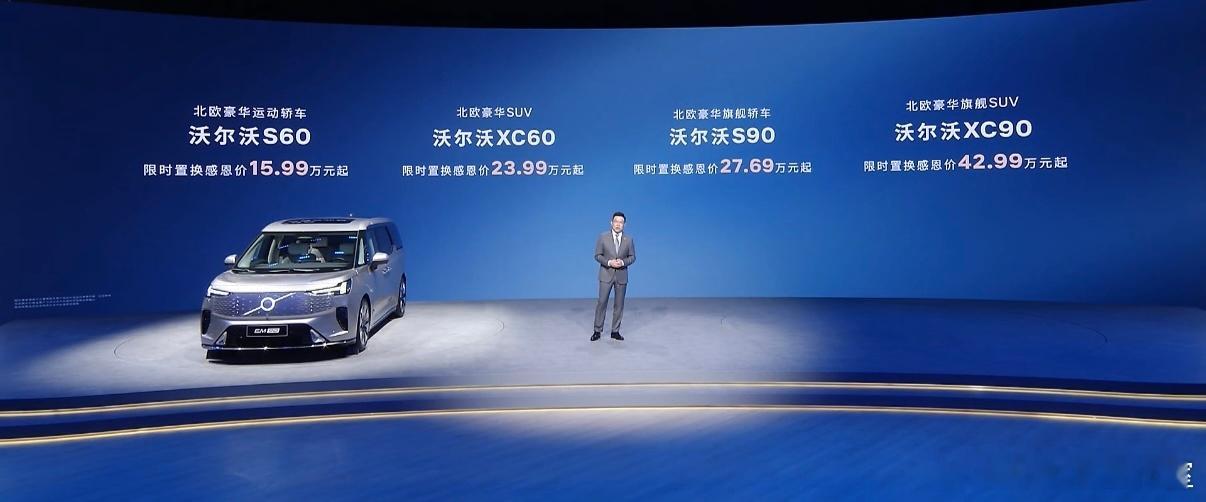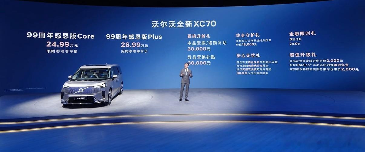 沃尔沃2027款 EM90(纯电MPV)限时置换感恩价 59.8万元 沃尔沃全新ES90(纯电轿车) 预售价 42.99万元起 沃尔沃全新EX90(纯电SUV) 预售价 53.99万元起 沃尔沃全新XC70(插混SUV) 99周年感恩版 Core 24.99万元(限时参考尊享价)99周年感恩版 Plus 26.99万元(限时参考尊享价) 2026北京国际车展 北京·中国国际展览中心顺义新馆