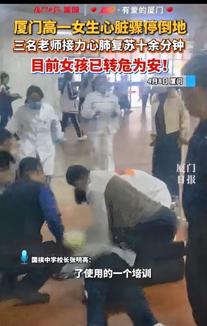 厦门高一女生在校内食堂心脏骤停!三名教师接力心肺复苏十余分钟,终于“拉”回她!校长:开学初刚给AED换了电池。 事情发生在4月8日中午12点03分,厦门市国祺中学的食堂里,正是学生就餐的高峰期。打饭窗口前挤满了排队的学生,整个食堂都是孩子们说话的声音,没人能想到,一场危及生命的意外,会突然降临在一名高一女生身上。 12点03分,高一女生林同学端着餐盘刚找到座位,突然身子一软,直挺挺倒在了地上。餐盘摔在地上发出刺耳的响声。周围的同学瞬间安静下来。有人吓得尖叫,有人赶紧往后退。几个胆大的男生凑过去喊她的名字,她没有任何反应。她的眼睛紧闭,嘴唇发紫。 正在食堂维持秩序的吴老师第一时间冲了过来。他蹲下来摸了摸女生的颈动脉,又探了探鼻息。他的脸色一下子变了。他立刻让旁边的同学去叫校医。他扯开嗓子喊,有没有会心肺复苏的老师。正在隔壁窗口打饭的体育老师张老师听到喊声,扔下餐盘就跑了过来。他跪在地上,立刻开始胸外按压。他的动作标准有力,每一次按压都能看到他手臂上的肌肉在用力。他嘴里数着数,节奏丝毫不乱。一分钟后,刚吃完饭的李老师也赶了过来。他接替张老师继续按压。 十几秒后,校医提着急救箱赶到了现场。她快速检查了女生的生命体征,确认是心脏骤停。她立刻拿出AED,撕开电极片贴在女生的胸口。AED发出语音提示,建议除颤。所有人都屏住了呼吸。除颤完成后,三位老师继续接力做心肺复苏。时间一分一秒过去。每个人的额头上都布满了汗珠。张老师的胳膊已经酸得抬不起来,换人的时候腿都软了。校长也赶到了现场。他后来跟记者说,学校的AED是开学初刚换的电池,就是怕关键时刻出问题。 12点16分,女生终于有了自主呼吸。她的手指动了一下。现场所有人都松了一口气。有人忍不住哭了出来。救护车很快赶到,把女生送到了附近的医院。经过后续治疗,女生已经脱离生命危险,身体正在逐步恢复。事后了解到,这三位老师都参加过学校组织的急救培训。学校每学期都会组织全体教职工进行心肺复苏和AED使用培训。培训不合格的老师,还要进行补考。学校在教学楼、食堂、操场等人员密集的地方,一共配备了6台AED。每台AED都有专人负责,每月检查一次,到期及时更换电池和电极片。 这件事传到网上后,很快引发了大家的热议。很多网友都为三位老师点赞。有人说,老师不仅教知识,还在关键时刻救了学生的命。也有人说,学校的应急准备太到位了,换电池这个细节,直接决定了这次抢救的结果。 心脏骤停的黄金抢救时间只有4分钟。超过这个时间,大脑就会出现不可逆的损伤。三位老师的果断出手,学校完善的应急设施和常态化的培训,共同保住了这个女孩的生命。这也给所有学校提了个醒,应急准备不能流于形式,每一个细节都可能关乎生命。 各位读者你们怎么看?欢迎在评论区讨论。