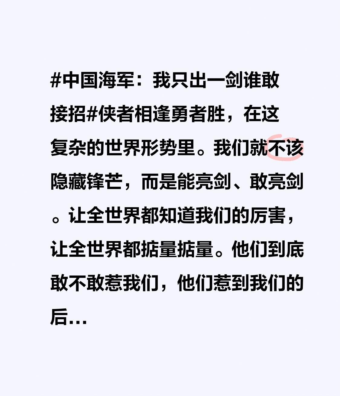 中国海军:我只出一剑谁敢接招侠者相逢勇者胜,在这复杂的世界形势里。我们就不该隐藏锋芒,而是能亮剑、敢亮剑。让全世界都知道我们的厉害,让全世界都掂量掂量。他们到底敢不敢惹我们,他们惹到我们的后果是什么。
