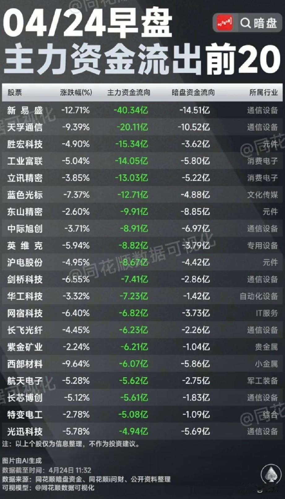 狂砸超210亿!4月24日早盘主力+暗盘双资金出逃TOP20全解析! 今日早盘合计主力资金净流出超210亿元,暗盘资金同步流出超80亿元,呈现“主力+暗盘”双资金出逃的格局,市场获利了结情绪浓厚。行业端,通信设备是资金出逃重灾区,多只AI光通信龙头位列前列;消费电子、PCB元件赛道也遭大额抛售,反映出市场对前期热门AI硬件赛道的高位兑现情绪。 个股梳理分析 1. 新易盛:早盘跌幅12.71%,主力资金净流出40.34亿,暗盘资金同步流出14.51亿,通信设备行业AI光模块龙头,前期涨幅较高,早盘遭资金集中抛售。 2. 天孚通信:跌幅9.39%,主力资金净流出20.11亿,暗盘资金流出10.52亿,通信设备行业光模块核心厂商,前期热门CPO标的,资金获利了结情绪浓厚。 3. 胜宏科技:跌幅4.90%,主力资金净流出15.34亿,暗盘资金流出3.62亿,元件行业PCB龙头,AI算力PCB标的,早盘遭大额资金出逃,或因前期涨幅较大。 4. 工业富联:跌幅5.04%,主力资金净流出14.05亿,暗盘资金流出5.80亿,消费电子行业全球代工龙头,AI服务器核心厂商,早盘遭资金集中抛售。 5. 立讯精密:跌幅3.85%,主力资金净流出13.03亿,暗盘资金流出5.22亿,消费电子行业消费电子+汽车电子龙头,早盘遭资金出逃,或因消费复苏不及预期。 6. 蓝色光标:跌幅7.37%,主力资金净流出12.71亿,暗盘资金流出4.88亿,文化传媒行业AI营销龙头,早盘遭资金抛售,或因AI应用赛道情绪回落。 7. 东山精密:跌幅2.60%,主力资金净流出9.91亿,暗盘资金流出8.85亿,元件行业精密制造龙头,消费电子+PCB业务,早盘遭资金出逃,暗盘流出规模较高。 8. 中际旭创:跌幅3.71%,主力资金净流出8.91亿,暗盘资金流出6.97亿,通信设备行业全球光模块龙头,AI算力核心标的,早盘遭资金获利了结,双资金同步流出。 9. 英维克:跌幅5.94%,主力资金净流出8.82亿,暗盘资金流出3.79亿,专用设备行业算力温控龙头,AI算力配套标的,早盘遭资金抛售,或因前期涨幅较大。 10. 沪电股份:跌幅4.95%,主力资金净流出8.67亿,暗盘资金流出4.42亿,元件行业PCB龙头,AI服务器PCB标的,早盘遭大额资金出逃,双资金同步流出。 11. 剑桥科技:跌幅6.55%,主力资金净流出7.41亿,暗盘资金流出2.86亿,通信设备行业光模块龙头,CPO核心标的,早盘遭资金抛售,前期涨幅较高,获利了结明显。 12. 华工科技:跌幅3.32%,主力资金净流出7.23亿,暗盘资金流出1.42亿,自动化设备行业激光+光通信龙头,早盘遭资金出逃,或因AI硬件赛道情绪回落。 13. 网宿科技:跌幅6.40%,主力资金净流出6.82亿,暗盘资金流出3.73亿,IT服务行业IDC+边缘计算标的,早盘遭资金抛售,或因算力租赁赛道情绪降温。 14. 长飞光纤:跌幅4.45%,主力资金净流出6.23亿,暗盘资金流出2.26亿,通信设备行业光纤光缆龙头,算力通信配套标的,早盘遭资金出逃,双资金同步流出。 15. 紫金矿业:跌幅2.24%,主力资金净流出6.21亿,暗盘资金流出1.04亿,贵金属行业黄金+铜业龙头,早盘遭资金抛售,或因大宗商品价格波动影响。 16. 西部材料:跌幅9.64%,主力资金净流出6.07亿,暗盘资金流出5.86亿,小金属行业稀有金属材料龙头,早盘遭大额资金出逃,暗盘资金流出规模较高。 17. 航天电子:跌幅5.28%,主力资金净流出5.62亿,暗盘资金流出2.75亿,军工装备行业航天电子龙头,早盘遭资金抛售,或因军工板块情绪回落。 18. 长芯博创:跌幅5.12%,主力资金净流出5.61亿,暗盘资金流出1.83亿,通信设备行业光通信器件龙头,早盘遭资金出逃,AI光模块标的,双资金同步流出。 19. 特变电工:跌幅2.78%,主力资金净流出5.08亿,暗盘资金流出1.09亿,综合行业新能源+输变电龙头,早盘遭资金抛售,或因赛道情绪波动影响。 20. 光迅科技:跌幅5.78%,主力资金净流出4.94亿,暗盘资金流出5.69亿,通信设备行业光模块龙头,AI算力核心标的,早盘遭资金出逃,暗盘流出规模超主力。 总结 今日跌幅高度集中于前期涨幅较高的AI硬件赛道,尤其是通信设备和消费电子板块,反映出市场资金在高位获利了结的情绪浓厚。这类标的前期受益于AI算力需求爆发,股价涨幅显著,当前资金集中出逃,或因短期情绪回落、获利盘兑现,部分标的同时叠加行业竞争加剧、订单不及预期的担忧。消费电子、PCB元件标的也遭同步抛售,反映出市场对消费复苏节奏的谨慎态度。 本文涉及资讯内容来自网络,仅供参考不构成投资建议!