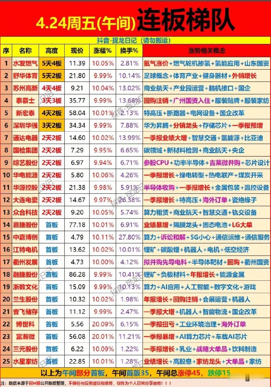 连板情绪全线爆发!4月24日午间25只涨停梯队深度拆解! 今日市场连板梯队结构完整,最高连板5天4板,2连板及以上标的13只,午间总涨停45只,情绪持续回暖。主线聚焦商业航天、算力/AI、一季报预增、特高压等,多题材共振;低换手缩量与高换手分歧标的并存,两只20cm标的涨停提升赚钱效应。 个股梳理分析 1. 水发燃气:5天4板,现价11.39,涨幅10.05%,换手2.81%,氨气涨价+山东国资,缩量连板,主线受益,资金承接力强。 2. 舒华体育:5天2板,现价21.80,涨幅9.99%,换手10.14%,足球概念+体育产业,体育消费复苏催化,连板情绪标的。 3. 苏州高新:4天4板,现价9.21,涨幅10.04%,换手13.02%,商业航天+脑机接口+国企,多题材叠加,连板高度标的。 4. 泰慕士:3天3板,现价35.77,涨幅9.99%,换手13.68%,回购注销+广州国资+服装,题材+国资加持,连板趋势明确。 5. 新宏泰:4天2板,现价58.04,涨幅10.01%,换手2.13%,特高压+国企改革,缩量一字连板,电网主线受益标的。 6. 深圳华强:3天2板,现价34.34,涨幅9.99%,换手7.88%,华为昇腾+存储芯片,AI算力分销主线,连板认可度高。 7. 通达电器:2天2板,现价14.60,涨幅10.02%,换手13.99%,一季报大增+氢能源,业绩+题材双催化,连板趋势明确。 8. 国检集团:2天2板,现价7.29,涨幅9.95%,换手6.65%,碳领域+商业航天+央企,多题材叠加,资金认可度高。 9. 综艺股份:2天2板,现价6.97,涨幅9.94%,换手6.71%,参股CPU+半导体并购,半导体主线受益,连板趋势明确。 10. 华电能源:2天2板,现价5.80,涨幅10.06%,换手4.26%,一季报增长+算电协同,业绩+题材双支撑,连板趋势明确。 11. 华源控股:2天2板,现价21.38,涨幅9.98%,换手5.91%,半导体收购+温控设备,多题材叠加,连板情绪标的。 12. 大连电瓷:2天2板,现价14.67,涨幅9.97%,换手26.38%,一季报增长+特高压,分歧换手连板,主线受益标的。 13. 众合科技:2天2板,现价9.20,涨幅10.05%,换手5.74%,算力租赁+商业航天,多题材叠加,连板认可度高。 14. 恩捷股份:首板,现价77.18,涨幅10.01%,换手6.91%,业绩暴增+隔膜龙头,锂电主线,首板资金抢筹。 15. 中嘉博创:首板,现价4.79,涨幅10.11%,换手27.80%,算力+通信运维,算力主线受益,高换手分歧首板。 16. 江特电机:首板,现价13.62,涨幅10.02%,换手10.01%,锂矿+机器人,锂电+多题材,首板资金抢筹。 17. 衢州发展:首板,现价4.73,涨幅10.00%,换手4.12%,拟并购半导体靶材,半导体主线+并购催化,首板标的。 18. 融捷股份:首板,现价86.28,涨幅9.99%,换手10.41%,锂矿+年报增长,锂电主线受益,首板认可度高。 19. 浙数文化:首板,现价15.09,涨幅9.99%,换手10.13%,算力+AI应用,AI+传媒主线,首板资金抢筹。 20. 兰生股份:首板,现价10.32,涨幅10.02%,换手1.98%,年报增长+会展运营,多题材叠加,首板标的。 21. 音飞储存:首板,现价11.12,涨幅9.99%,换手2.47%,一季报大增+机器人,业绩+题材双催化,首板标的。 22. 博世科:20cm首板,现价5.56,涨幅20.09%,换手6.15%,一季报扭亏+环保,环保主线受益,弹性标的。 23. 富瀚微:20cm首板,现价56.08,涨幅20.01%,换手11.21%,一季报暴增+AI芯片,半导体主线受益,弹性标的。 24. 三元股份:首板,现价6.22,涨幅10.09%,换手1.22%,一季报增长+乳业,消费主线受益,首板标的。 25. 水星家纺:首板,现价22.85,涨幅10.01%,换手1.28%,业绩增长+家纺龙头,消费主线受益,首板标的。 总结 整体来看,今日午间连板梯队有三大特征:一是结构完整,从高连板到首板梯队清晰,午间总涨停45只,情绪回暖;二是主线聚焦四大方向,多题材共振带动热度;三是资金承接分化,低换手锁仓与高换手分歧并存,20cm标的提升情绪空间。 风险提示:以上内容仅为市场公开数据整理,不构成任何投资建议,理财有风险,投资需谨慎。