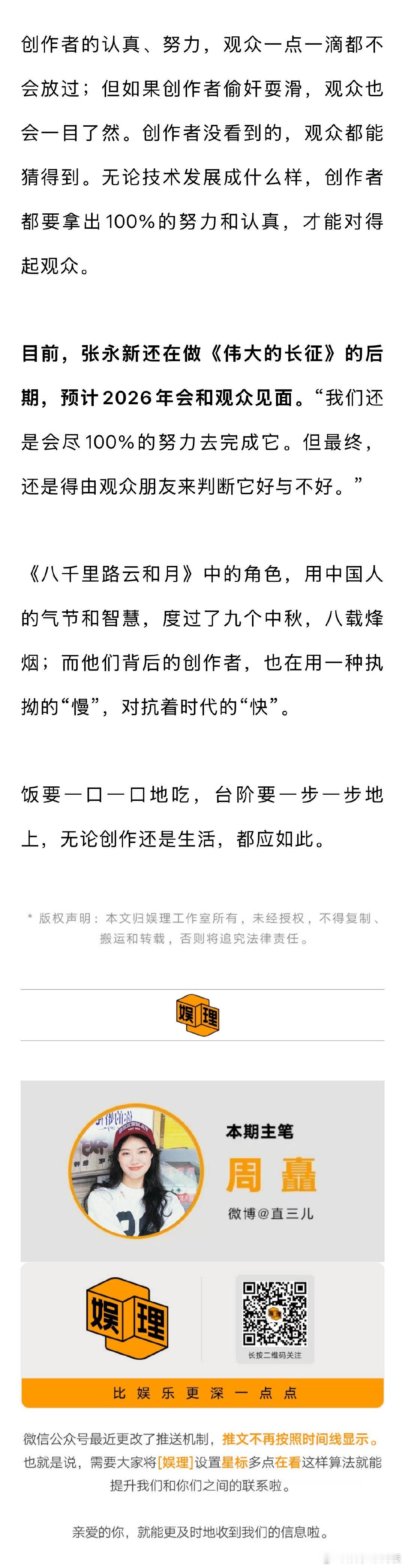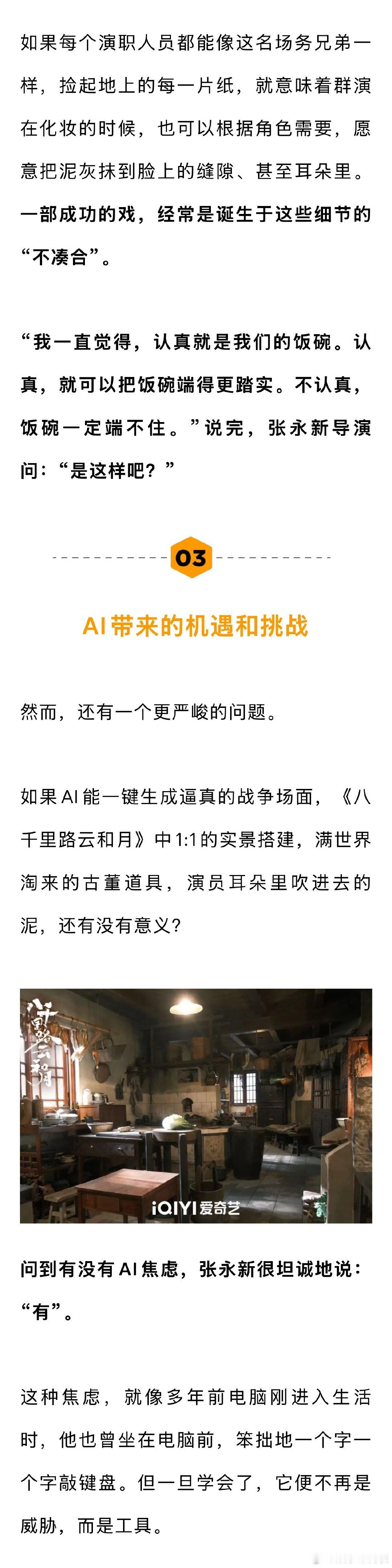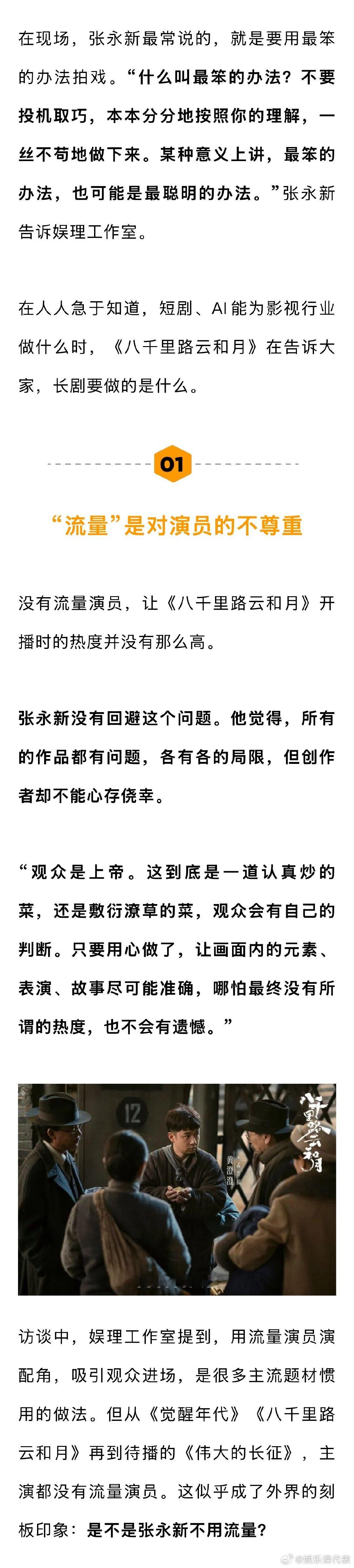 张永新回应不用流量 张永新谈和于和伟三搭 问到有没有AI焦虑,张永新很坦诚地说:“有”。目前,张永新团队正在“小步快跑”地探索AI。“我在努力跟着他们学”,张永新笑着说。“目前,AI一键生成的镜头在播出量级上还达不到影视剧标准,但我相信将来一定会实现。不过,再好的技术一定要为人所用。AI反而能倒逼我们拿出百倍的精气神,激活自己的创造力,因为人类内心最幽微的痛苦、抉择、挣扎,AI还难以完全吸收和表达。”娱理独家↓