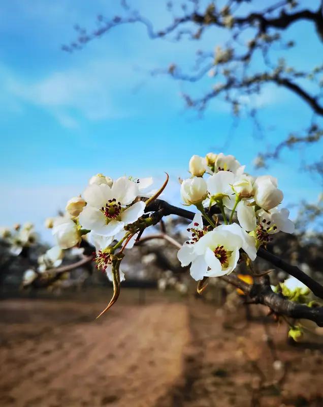 梨花一般在春季的3 - 5月开放,不过不同地区花期有差别。南方多3月开花,北方则在4、5月。它的花期不长,不到20天。 春分二候(约3月26 - 30日)对应的花信就是梨花,此时昼夜平分,阳气渐盛。梨花花朵通常为纯白色,花蕊呈紫红色或粉红色,常6 - 12朵簇生于枝顶。盛开时满树雪白,素雅清新。“梨花带雨”形容花瓣沾雨后更显晶莹剔透。而且梨花不仅能观赏,其果实梨还能鲜食、制梨膏、酿酒,有润肺清心之效。在文化里,它既有清白孤高的一面,也有凄婉哀愁的一面。