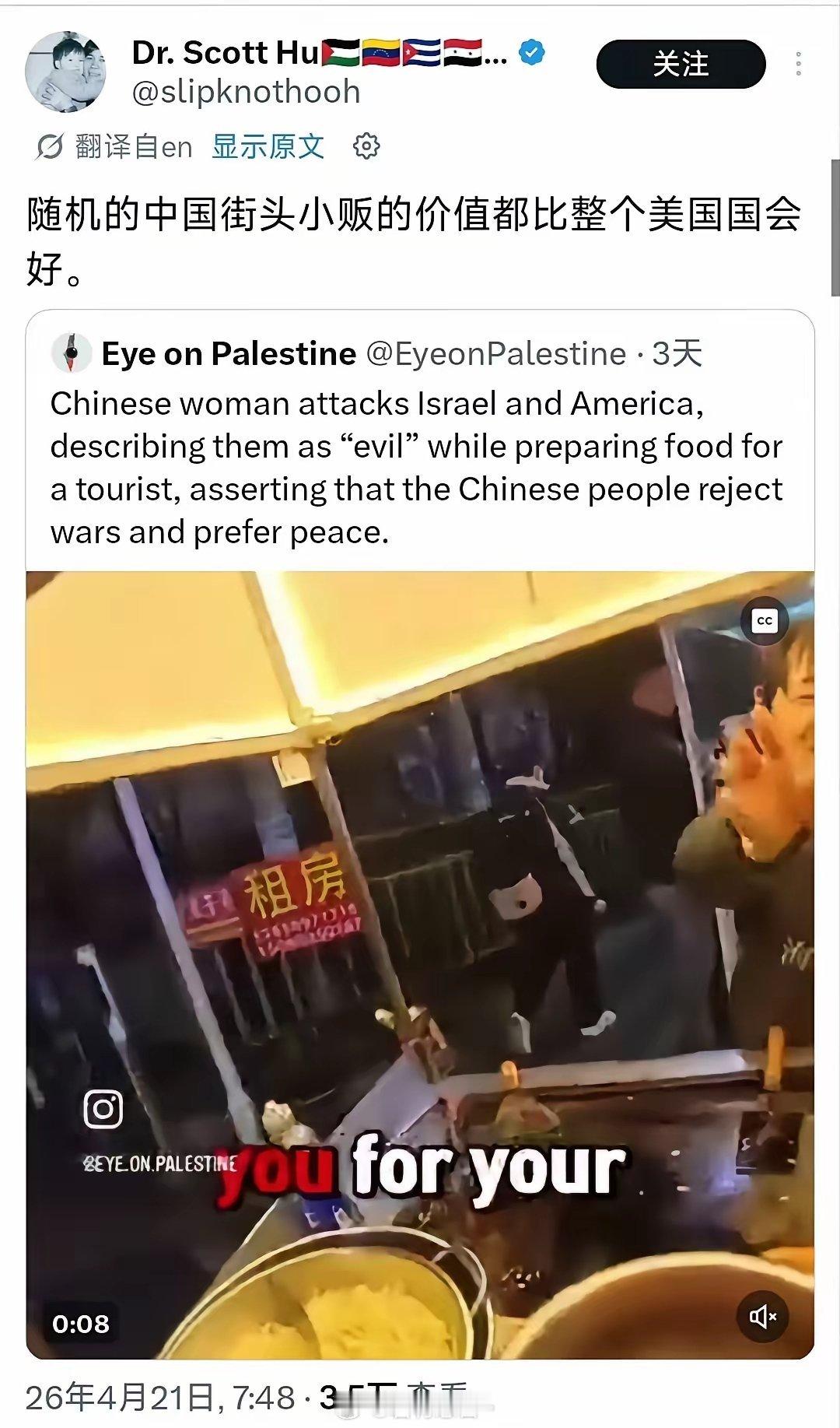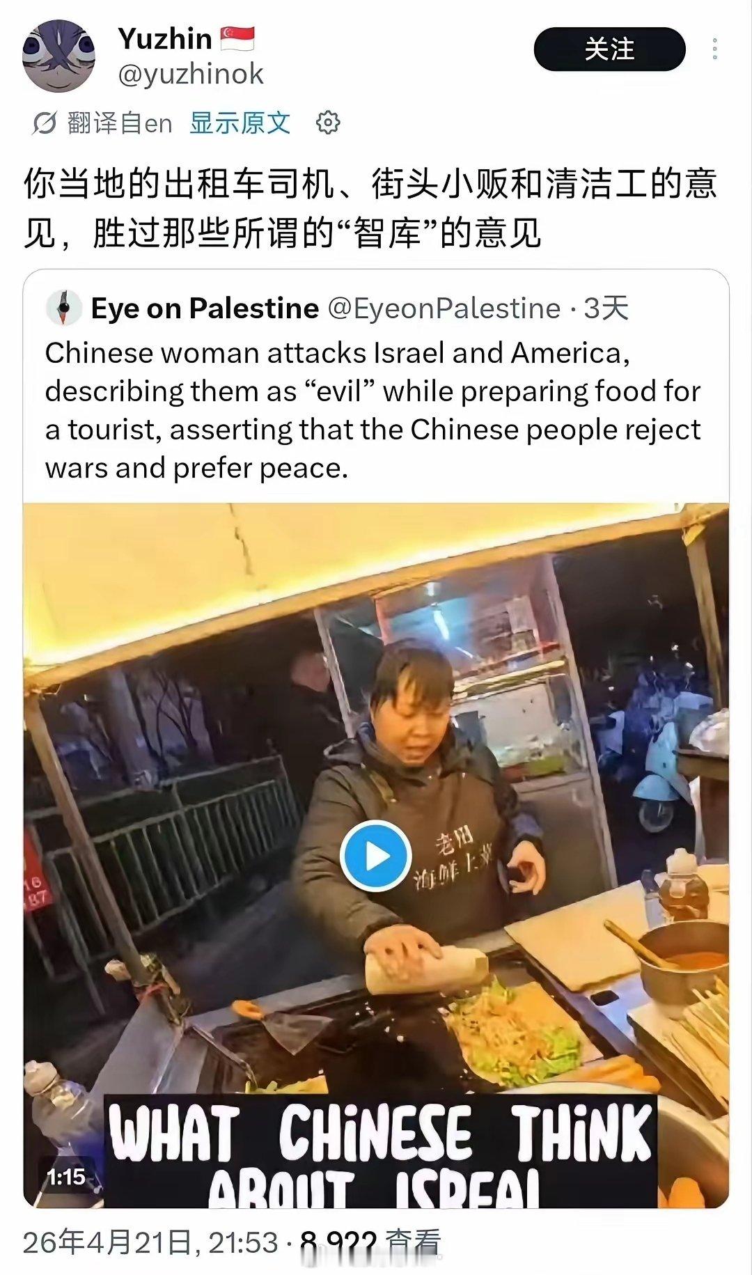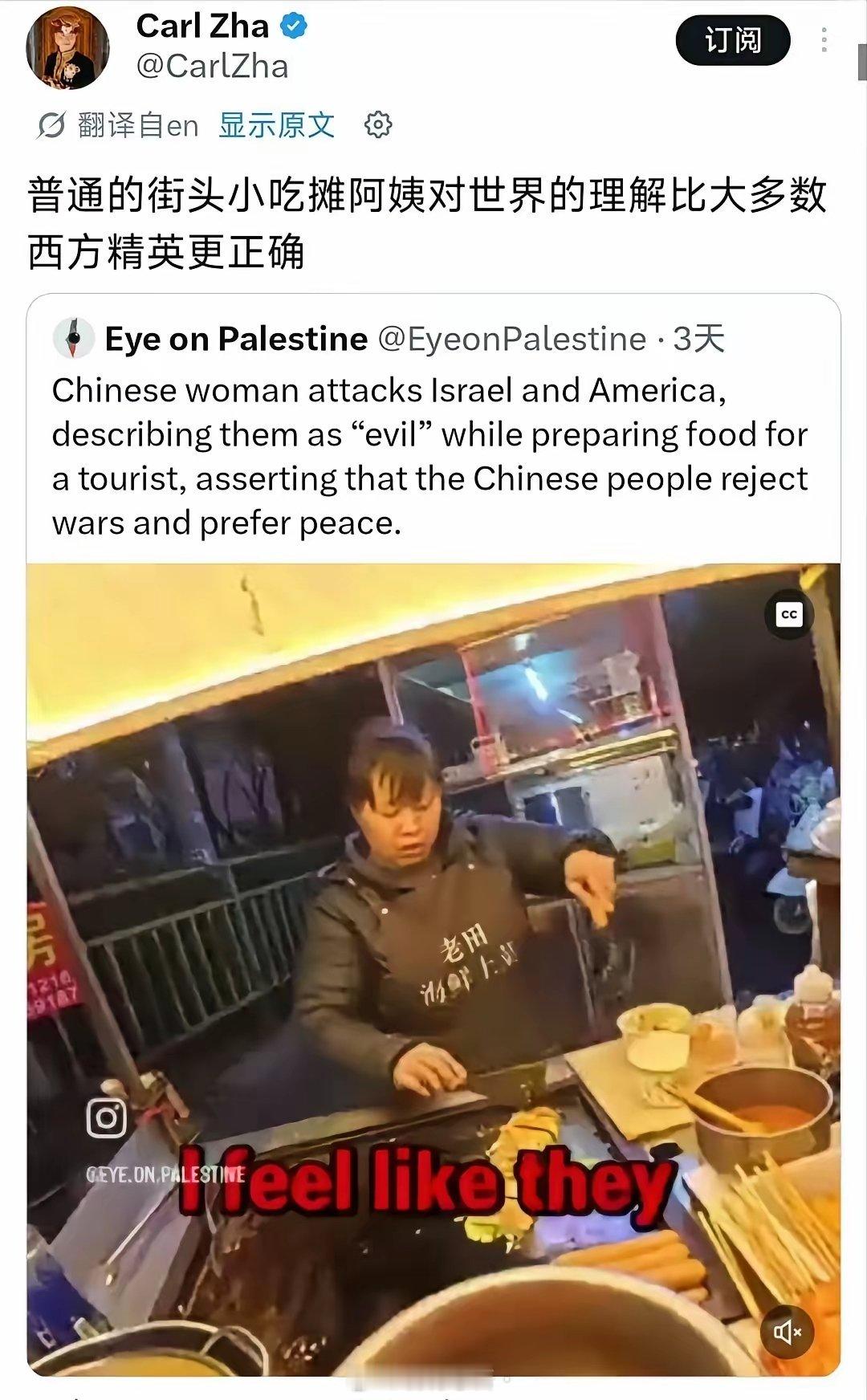 国外网友发帖,中国小吃摊阿姨在和国外游客聊天时表达反战和平立场的视频,在海外社交媒体引发热议,多国网友借此对比西方舆论环境,称赞阿姨的清醒与直白