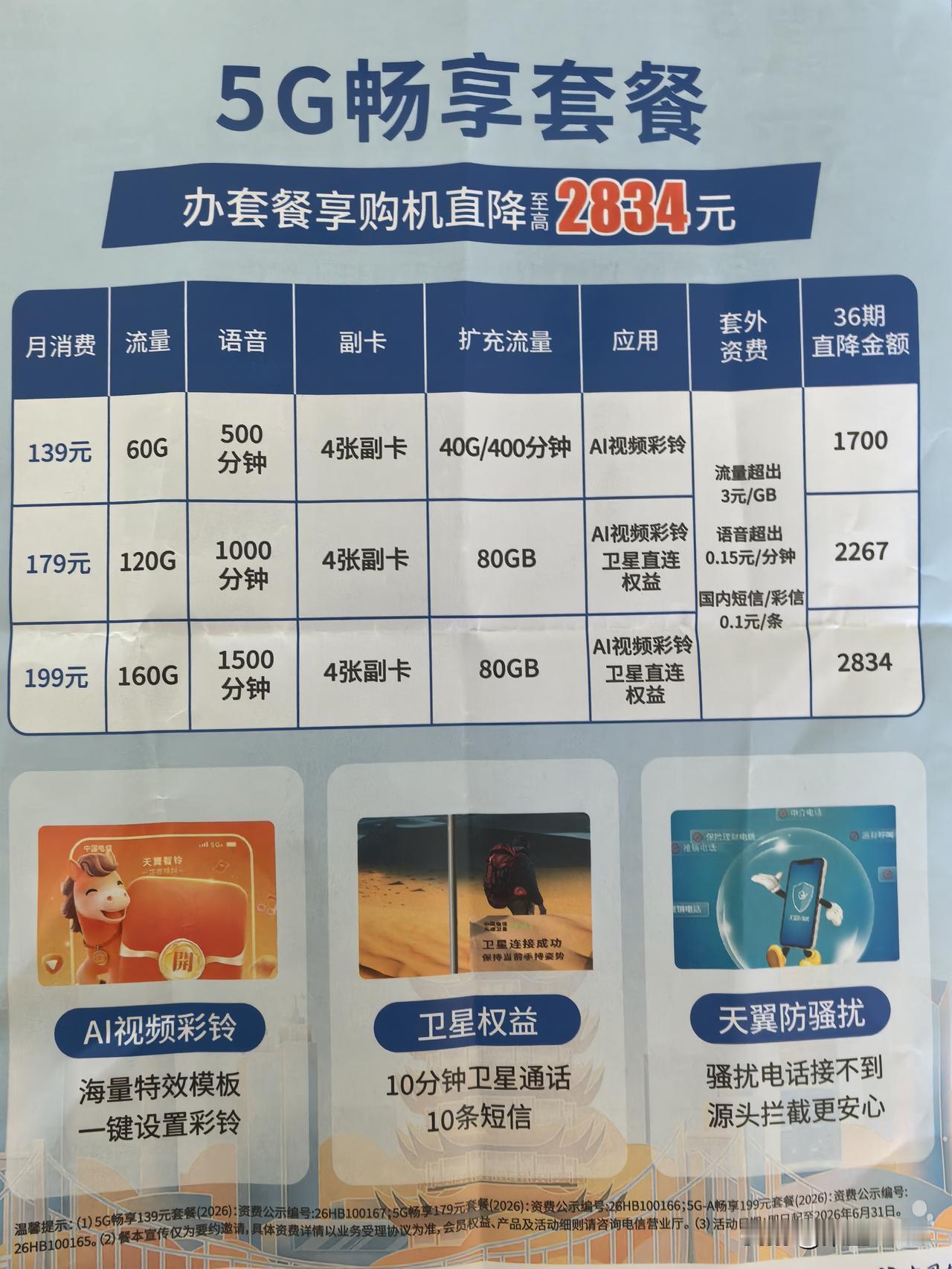 家里5年前搬新家,装宽带时,小区里有中国电信的销售团队上门服务,很热情,我选择了每月129元,含5G宽带500M,电视IPTV,两个电话卡,流量40G,通话1000分钟的融合套餐。 一用就是5年。月月交129元。没有想过划算或节省的问题。 前几天偶尔上网,看有人写自己家宽带费一年才几百元,手机费每月才8元,说应该把宽带和手机号分开,绑一块不合算。 今天上午我去了位于武汉汉阳钟家村的中国电信营业部,较大的一个正规营业厅。 工人人员详细解释了,说中国电信纯单个宽带,一年也要1000多元,没有网上说的几百的,但有一种情况,如年满65周岁,宽带费可一年300元,但宽带是100M。 我反复问了,她反复确定了,说真的是这样。 我又问有没有交129元返30元这种,把月费降为99元的,她说没有。 我又问可否将宽带降至300M,费用降到100元以下的套餐,她说没有。 我又去前台问了一遍,说法一致。 我拿了一份资料,仔细看了一下,现在居然已没有129元的套餐了。最低价的是139元,但有四张副卡,还有AI视频彩铃。 后我想那些很便宜的宽带有可能是中国移动或联通的。过几日抽空也去了解一下。 当前来自武汉汉阳钟家村中国电信营业厅的官方解释,129元一月宽带手机电视IPTV融合套餐不存在欺负老用户,都是一视同仁的。 最近头条上常常看到五花八门的宽带费手机费,感觉这个市场有点水深,看不准也摸不清了。