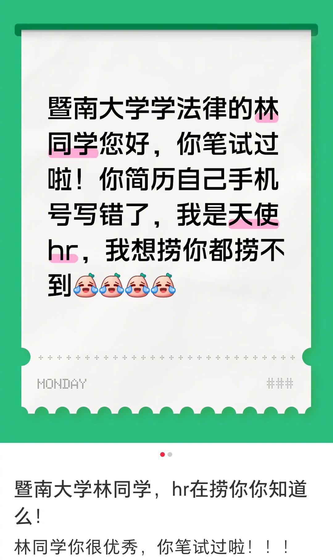 #面试填错手机号广东HR全网捞人#【广东再现暖心HR:一则全网“捞人”面试帖背后的揽才诚意】#HR发帖找填错手机号暨大毕业生#暨南大学林同学,HR在捞你,你知道么?”近日,一则HR寻找求职者的帖子,在小红书接连被转发、评论。原来,暨南大学2026届硕士毕业生林同学求职投递简历时,不慎填错了联系方式,HR小雅(化名)线下寻找5小时依然无果后,决定发帖“捞人”,最终仅花两小时就找到了当事人。