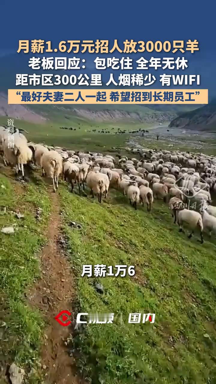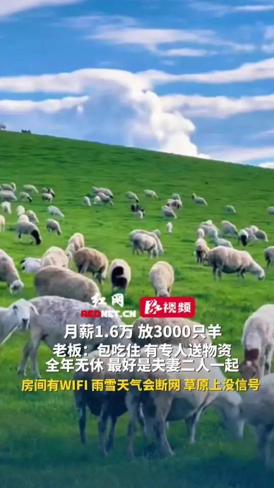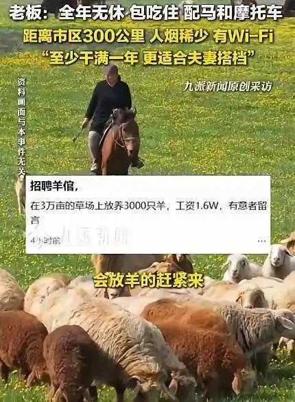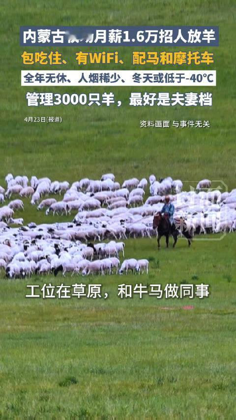 月薪1.6万全年无休放牧,你会为高薪忍受草原的孤独与严寒吗? 内蒙古锡林浩特一牧场近日以月薪1.6万元招聘员工,负责管理近3000只羊。工作地点位于三万多亩的牧区,距离市区达300公里,草原辽阔常年难见外人。岗位全年无休,夏季放羊,冬季则需每日喂羊两次,每次耗时两个多小时,劳动强度较大。牧场为员工提供食宿,并配备马匹、摩托车,有专人运送物资。夏季员工可住蒙古包,有水有电;冬季则需在零下四十多度的严寒中自行烧炉取暖,虽有平房和Wi-Fi,但雨雪天气常断网且手机无信号。老板更倾向招聘夫妻搭档,一人放羊一人做饭,相互照应,且要求最少工作一年,需耐得住寂寞。这份工作描绘了夏季草原的诗意与冬季生存的挑战,高薪背后是对体力与心理的双重考验。 牧业招聘 牧民工作