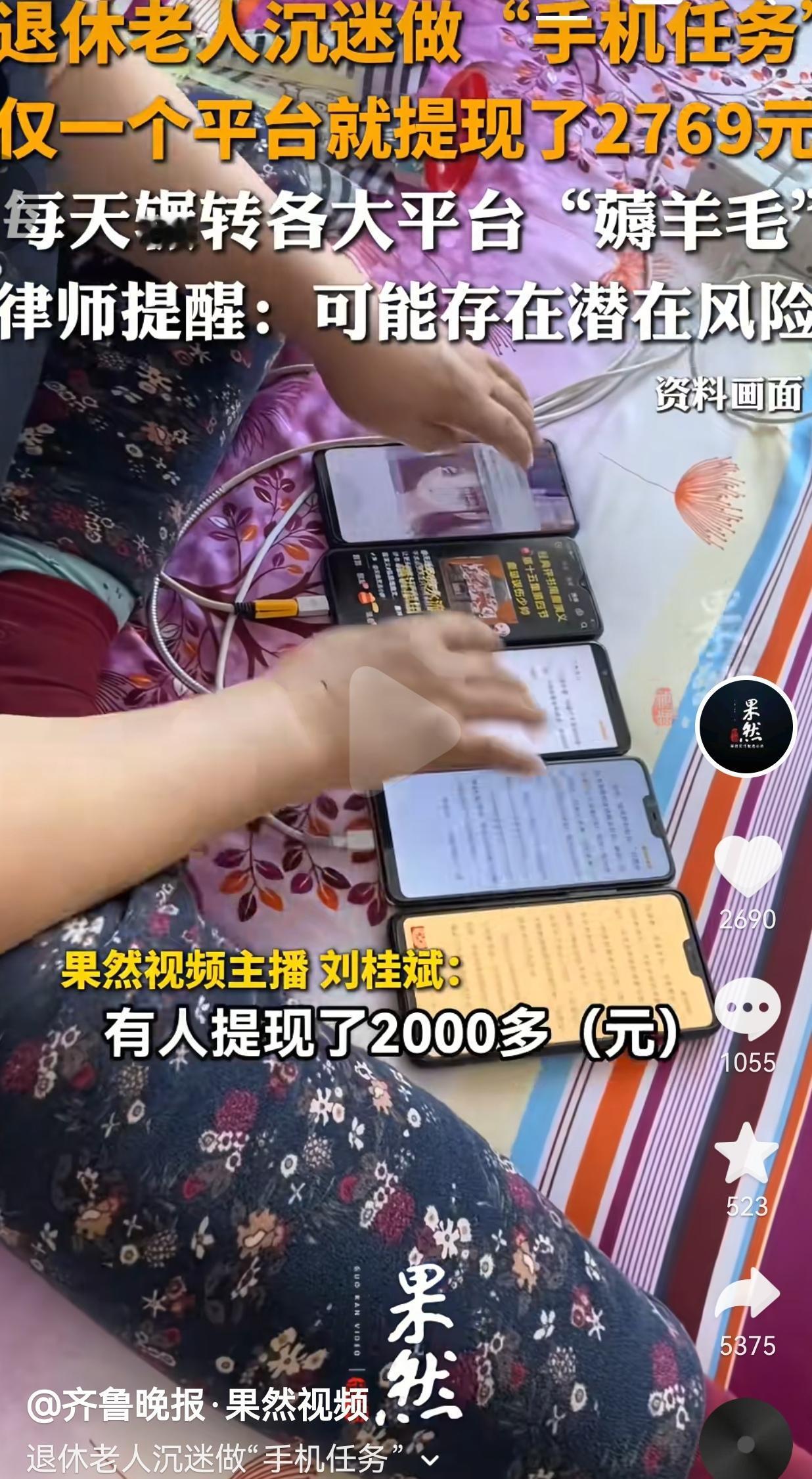 退休阿姨靠刷视频薅羊毛,一天排满日程,自制“手机冰箱”,律师紧急提醒 山东的刘阿姨,今年62岁,退休后不跳广场舞不打牌,每天一睁眼就围着一堆旧手机转。 儿女淘汰的几部旧手机,被她当成了“生产工具”。她辗转各大短视频平台,挂着视频自动循环播放,一挂就是六七个小时,连走路、睡觉、做家务都不带停的。 老手机长期高负荷运转,一烫就卡,刘阿姨为了不耽误“赚钱”,愣是自己捣鼓出了一套“手机降温神器”:把纸盒改造成手机支架,底下垫上吸水毛巾,再放上冰袋轮流降温,生怕手机过热“罢工”,耽误她的“进度条”。就这么干了两年多,光在一个平台就攒了两千多块,多的时候一天能有十几块。 刘阿姨的日程,排得比年轻人上班还满。早上起来先把手机挨个挂上,做饭时摆在厨房窗边循环播放,晚上睡觉也不摘,手机24小时连轴转。 她跟街坊邻居聊天,三句不离“今天哪个平台给的多”,连楼下乘凉的老姐妹,都被她拉着一起“干事业”。 小区里不少老人都跟风加入,每天扎堆坐成一排,人手一部手机,低着头不停划,嘴里念叨着“再刷一会儿就能提现了”。 网友看到后评论说:我妈现在也这样!天天抱着手机刷,说刷视频能赚钱,拦都拦不住,眼睛都熬红了,我劝她少刷点,她还跟我急! 也有的网友说:看着挺心酸的,几块钱几块钱的赚,眼睛、颈椎都熬坏了,为了这点小钱,把身体搭进去,值吗? 还有的网友说:我爸之前也刷,手机放床上一挂一晚上,被子都被手机烫出印子了,跟他说了好几次有火灾隐患,他还说我小题大做! 更有网友表示:我奶奶更夸张,手机充电的时候也挂着视频,我一回家就看见手机边充电边发烫,跟她说危险,她还说“别人都这么干,哪有那么多事”! 说实话,我看着这些画面,心里真不是滋味。 刘阿姨们,不是懒,也不是贪小便宜。她们一辈子省吃俭用,见不得一点浪费,总想着能多赚一点是一点,能给儿女减轻点负担,能给自己多攒点养老钱。 几块钱的收益,在她们眼里,不是小钱,是实实在在的“劳动所得”,是她们退休后还能“创造价值”的证明。 可这份“勤劳”,背后藏着多少看不见的风险? 手机长期高负荷运转,发烫、边充电边循环播放,藏着多大的火灾隐患,她们不懂;长时间盯着屏幕熬到深夜,熬坏了眼睛、熬垮了颈椎,这些慢性病的危害,她们也不往心里去。 有律师和反诈人员提示,有些平台打着“刷视频赚钱”的幌子,违规索要隐私信息,诱导老人乱开权限,一不留神就掉进诈骗的坑里。 可这些风险,对她们来说,太遥远,也太抽象了。她们只看得见,账户里每天多出来的那几块钱,却看不见,为了这几块钱,她们付出的时间、健康,还有潜在的安全隐患。 她们以为自己是在薅平台的羊毛,殊不知,自己才是被平台用几毛钱小恩小惠拿捏住的人,被榨干了时间和精力,还可能被悄悄偷走了个人信息。 我知道,很多人会说,“老人闲得慌,找点事干不好吗?”“不偷不抢,凭自己双手赚点小钱,有什么错?” 可问题是,这根本不是什么“凭自己双手赚钱”,这是平台用几毛钱的甜头,精准拿捏了老人退休后的落差感、被时代落下的焦虑,还有想给儿女减轻负担的心思,把她们牢牢困在了小小的手机屏幕里。 这些老人,一辈子辛苦,老了老了,本该安享晚年,却被这些披着“赚钱”外衣的套路,推着连轴转。刘阿姨的“手机冰箱”,看似是老人的“智慧”,实则是被平台套路的无奈。 可这些所谓的“羊毛”,真的能给她们带来安全感吗?几块钱的收益,换不来健康,也换不来真正的安稳,只会让她们在手机屏幕前,越陷越深,甚至把养老钱都搭进去。 别再让父母为了几毛钱的“羊毛”,熬坏了身体,困在了屏幕里。他们一辈子省吃俭用,不是为了老了还被这些套路算计的。 比起几块钱的收益,他们的健康和安全,才是最该守住的底线。 别让晚年的“小甜头”,变成了一辈子的“大隐患”。 对此,你怎么看? 来源:齐鲁晚报 果然视频