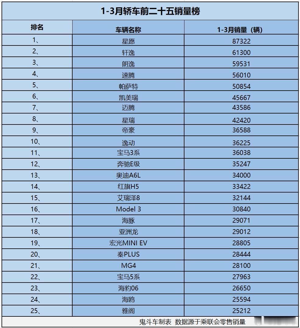 为让网友们看得清楚,小编根据乘联会零售销量数据,整理出1-3月轿车市场销量排名前二十五榜单,可以看到,榜单上,共有16款轿车在1-3月份累计零售销量超过3万辆。接下来,看看具体车型排名与销量表现。