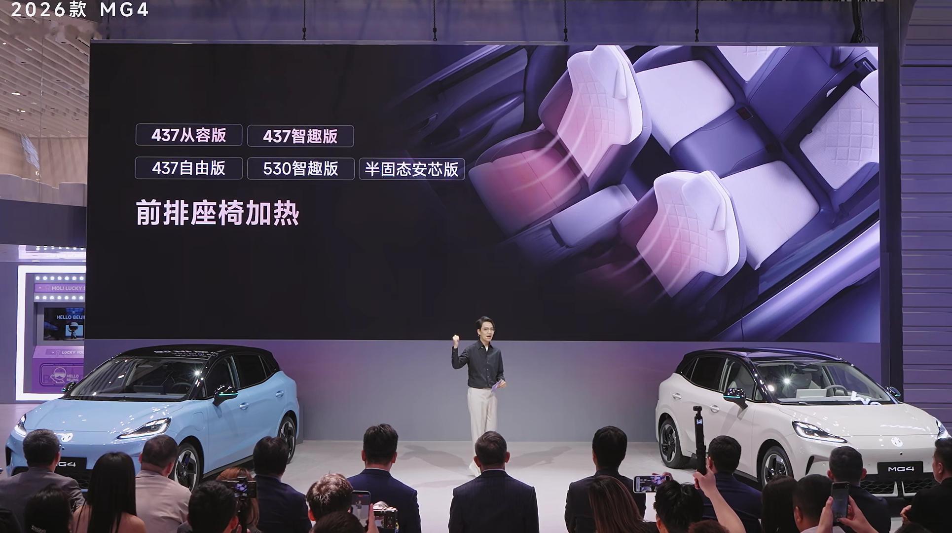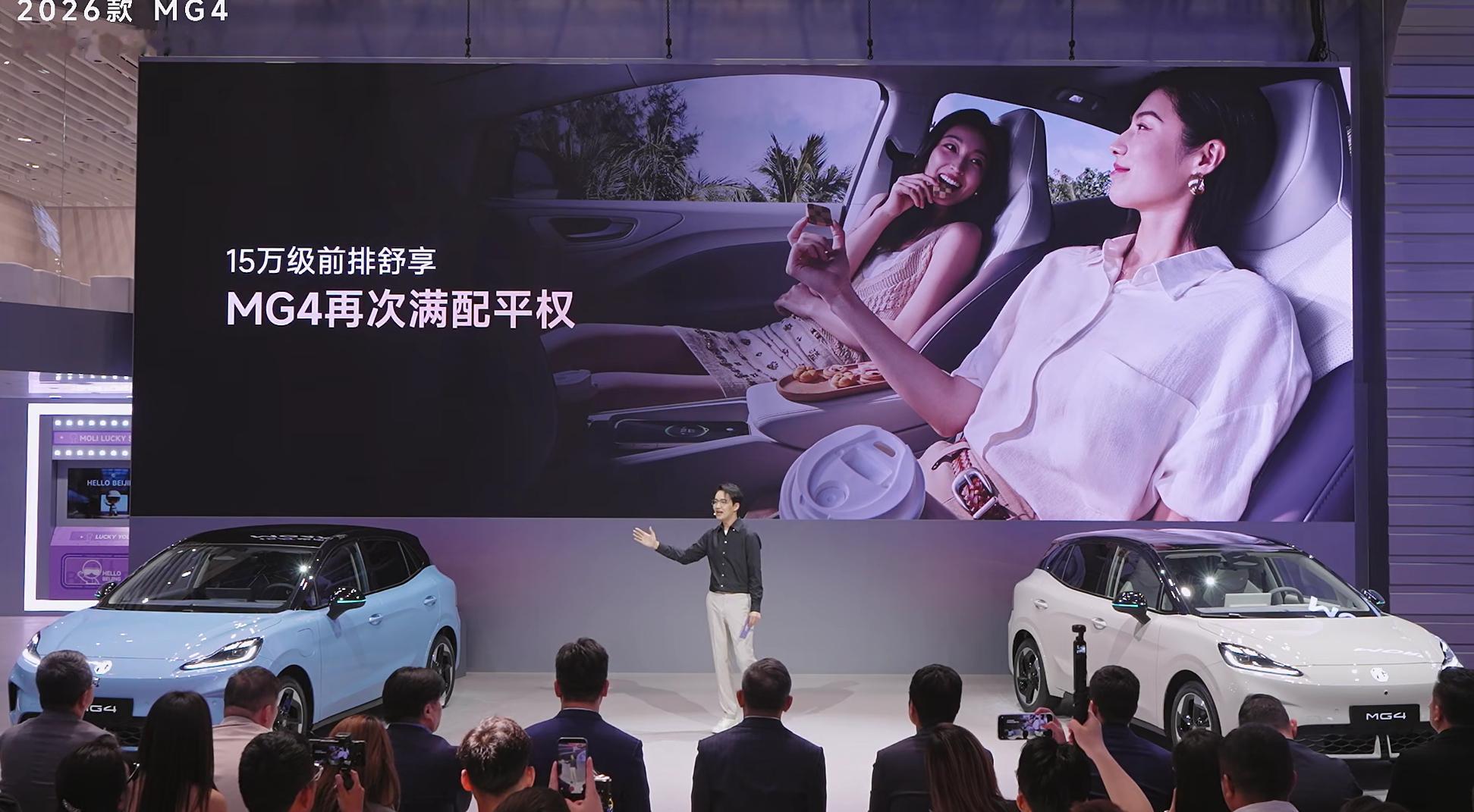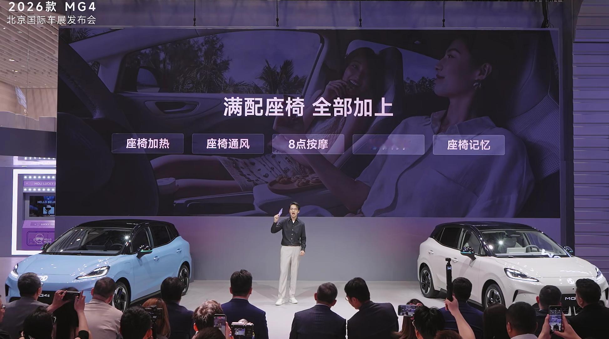 2026款MG4来了,这次满配座椅,支持座椅加热、座椅通风、8点按摩、电动调节和座椅记忆,新增一键小憩功能,顶配还有一块15.6英寸 2.5K超清大屏,还有新增的车外喊话功能,前车加塞的时候非常好用,直接可以喊话2026款MG4智驾数码团