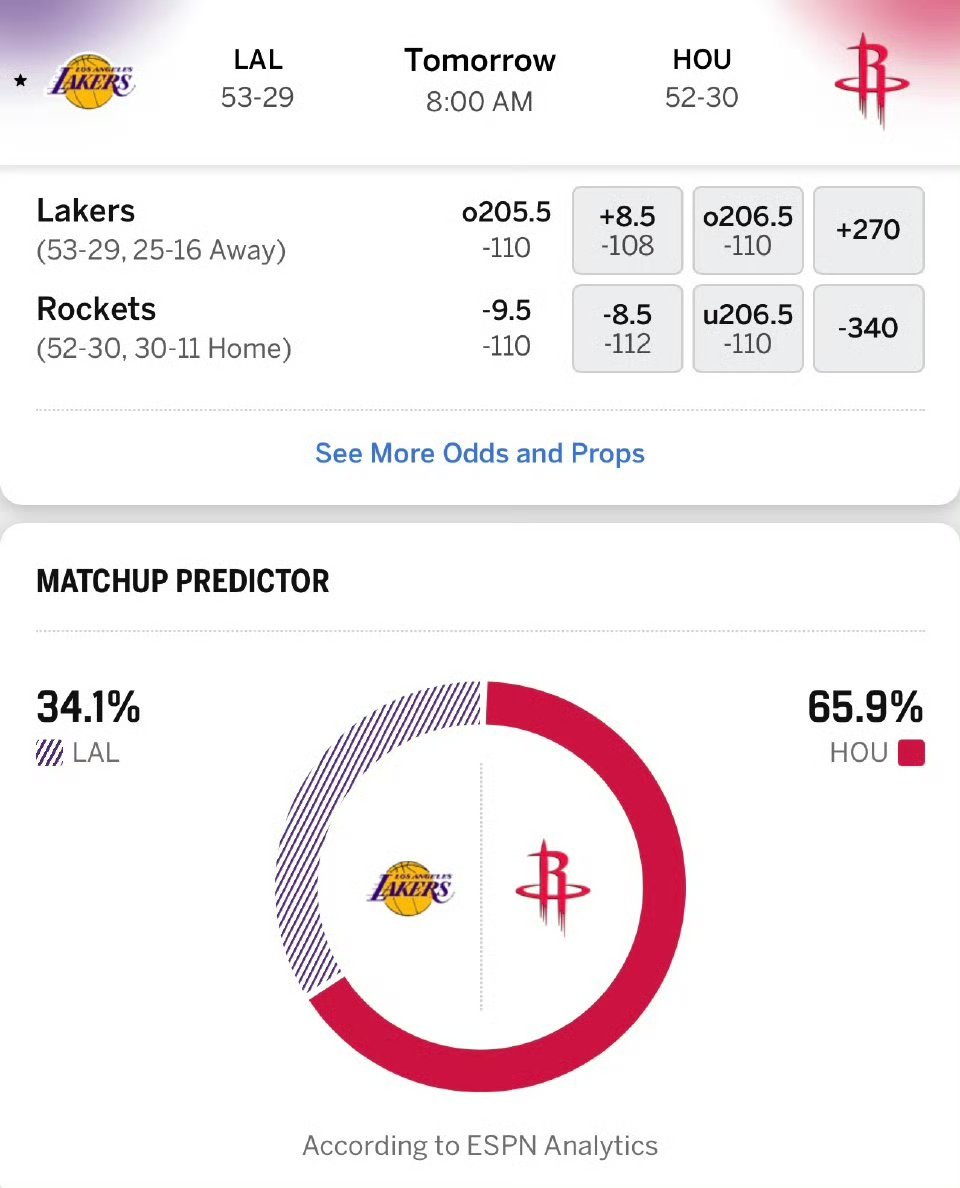 洛杉矶湖人队 明天早上8点,湖人vs火箭 G3,里夫斯出战成疑,如果能打大概率先打替补,杜兰特脚踝扭伤,也是出战成疑的状态。目前湖人大比分2-0领先火箭,ESPN预测更看好火箭取胜。