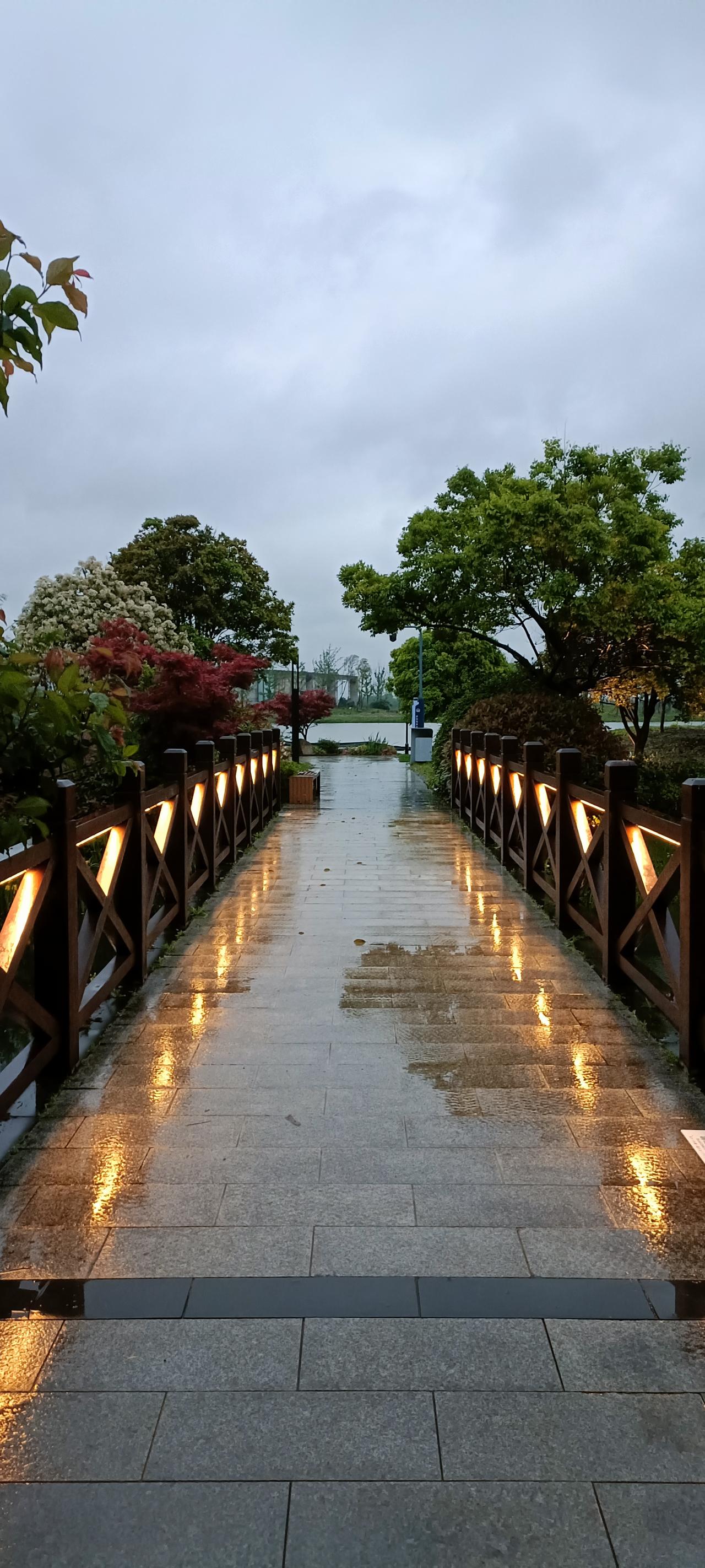 雨后漫步,湿漉漉的石板路,两旁是温暖的灯光,仿佛置身于童话世界。🌧️💡✨ 上联:雨后园林路, 下联:绿树映长廊。