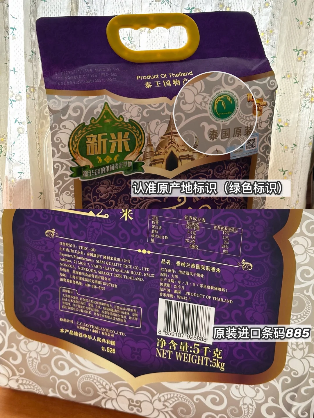 包装上的绿标是正宗泰国茉莉香米原产地标识