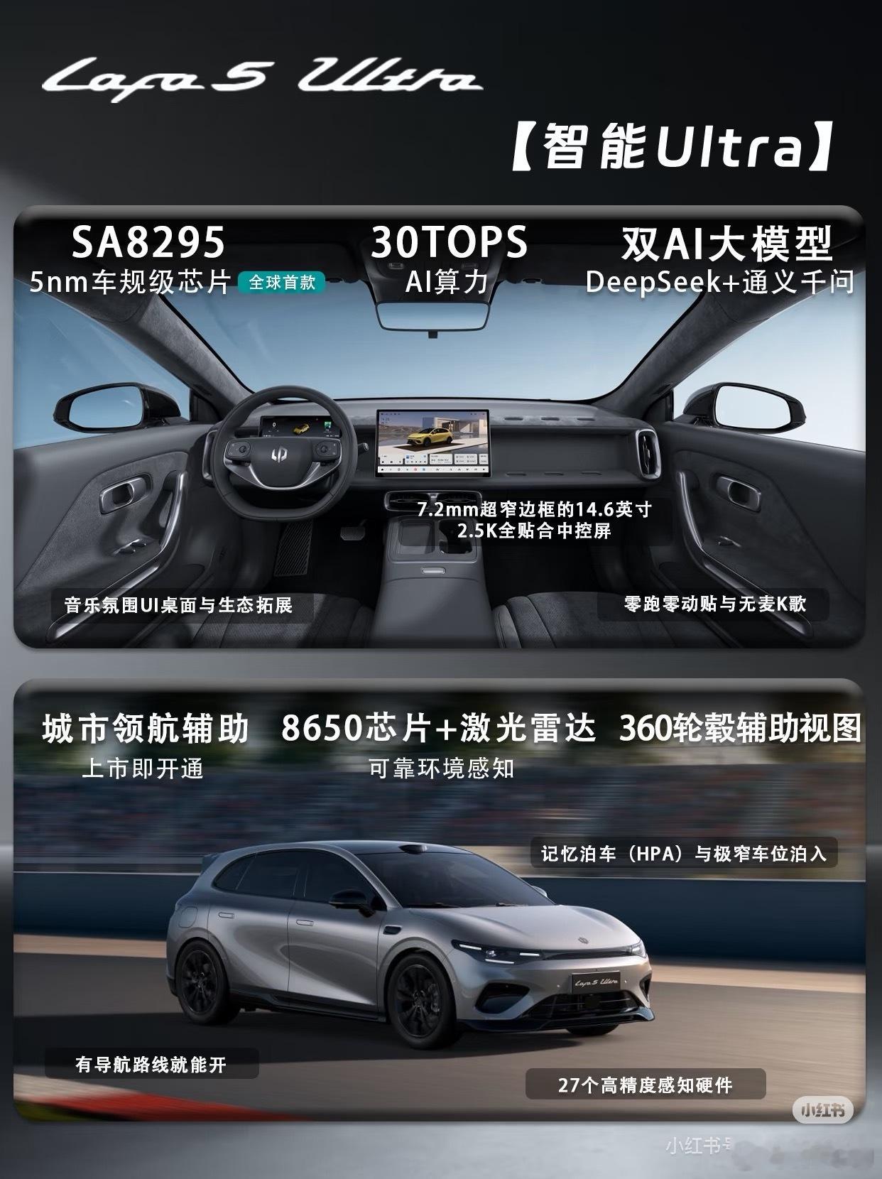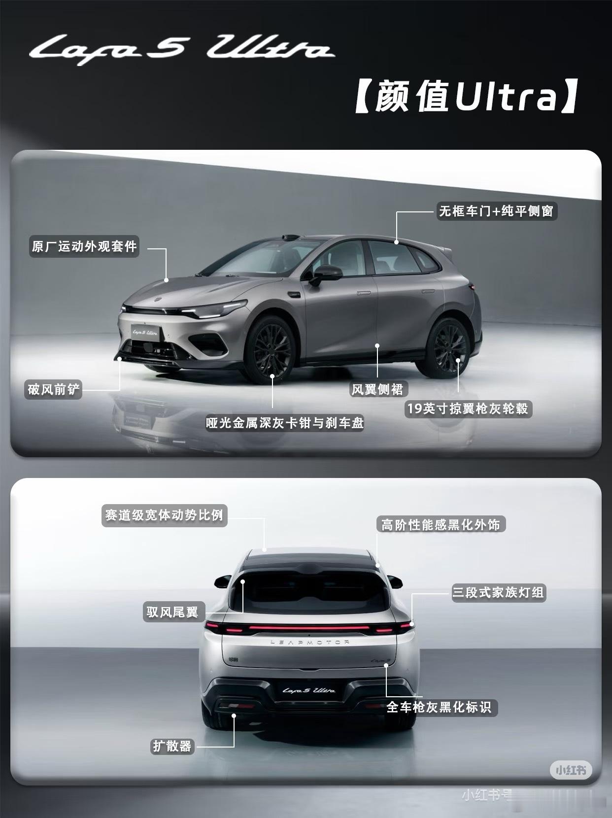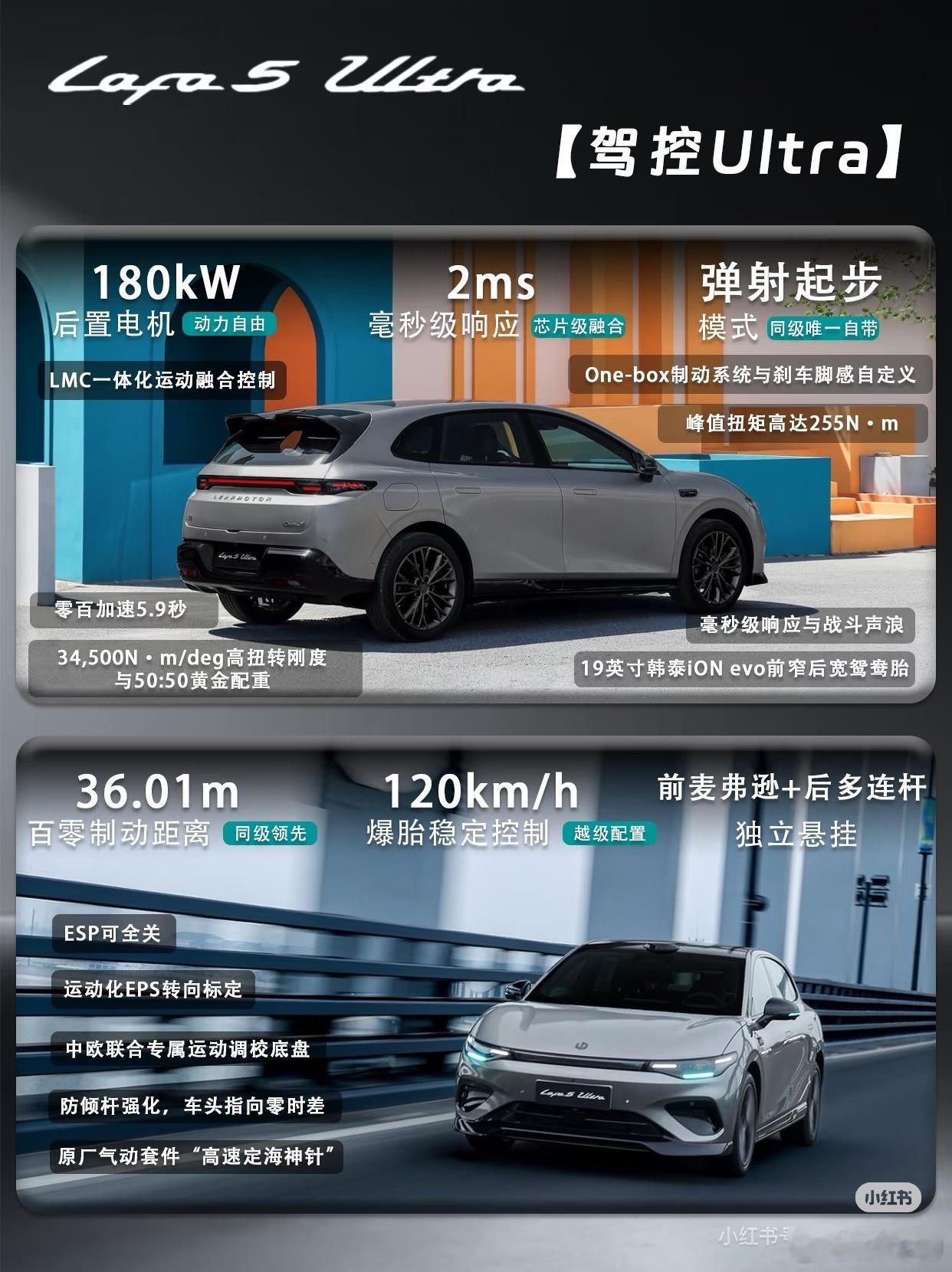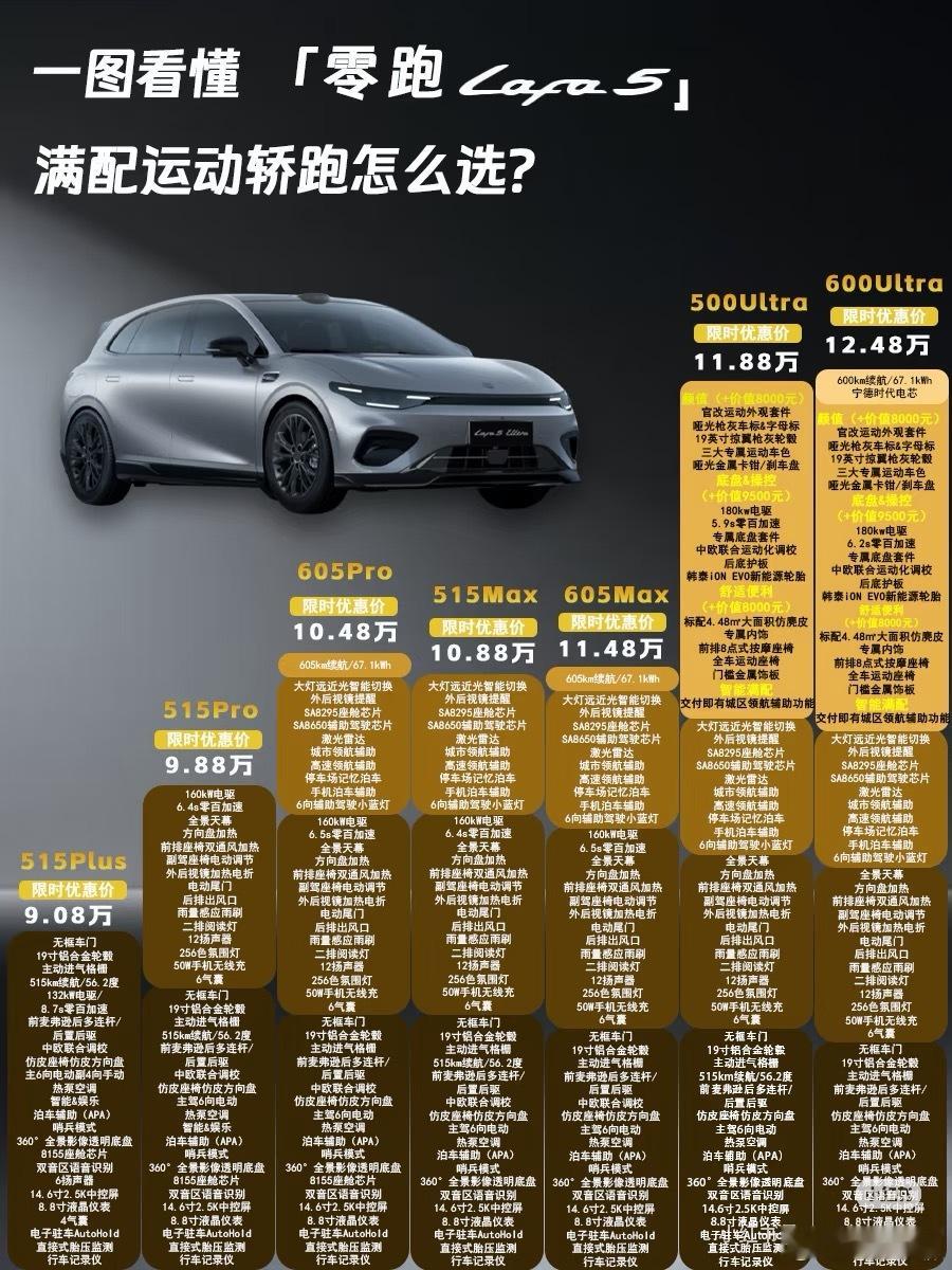 零跑Lafa5 Ultra正式登场,作为LAFA5车系的顶配版型,带来颜值、驾控、智能、舒适四大越级进阶。✨今日一图看懂帮你盘清楚,不同版本怎么选❓🚗颜值与舒适方面,全系Ultra标配原厂运动套件(破风前铲、风翼侧裙、驭风尾翼、扩散器)、19英寸枪灰轮毂+哑光深灰卡钳、全车黑化车标,以及雷厉黄/星芒绿/液态银三款新车色,战斗姿态出厂即巅峰💪。座舱内采用仿麂皮运动座椅(带Ultra刺绣)、前排8点式座椅按摩、车身同色印花安全带,兼顾极限驾控与日常舒适。🚗驾控与智能方面,180kW后驱电机带来5.9秒零百加速,中欧联合运动底盘调校(车身压低10mm、防倾杆强化、减振器低速阻尼提升15%),配合韩泰iON evo高性能鸳鸯胎(保时捷Taycan同款)和36.01m制动距离,ESP可全关,赛道乐趣拉满。🤖智能上,城市领航辅助(上市即开通)、8650芯片+激光雷达、360轮毂辅助视图,以及SA8295智舱+14.6英寸2.5K大屏+双AI大模型。🚗共享亮点方面,还拥有无框车门+纯平侧窗、三段式灯组、86%得房率、1.02㎡全景天幕+电动遮阳帘、零甲醛座舱等LAFA5全系高光配置。两个版本怎么选?⭐500Ultra适合追求极致推背感的玩家;⭐600Ultra,适合经常跨城自驾、希望减少充电频次的用户。所以,要快选500,要远选600。零跑Lafa5 Ultra,你会选哪款❓评论区聊聊~