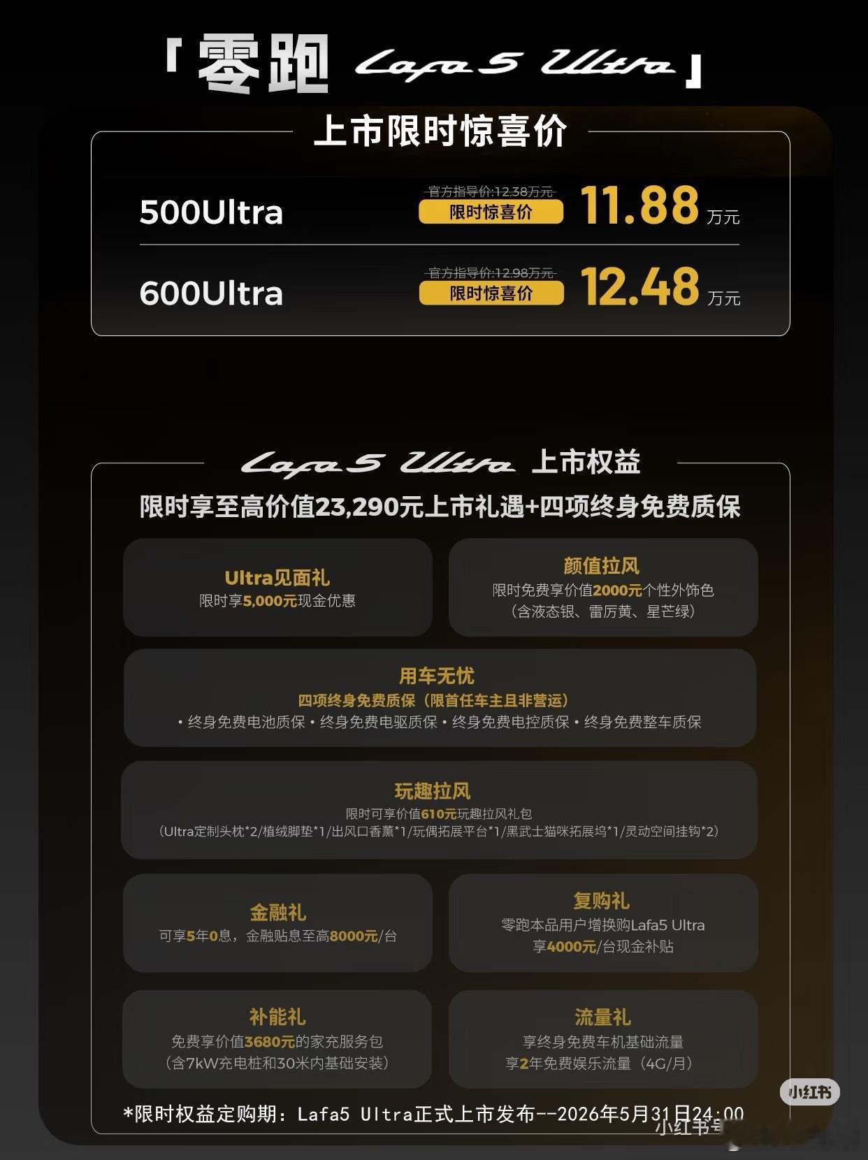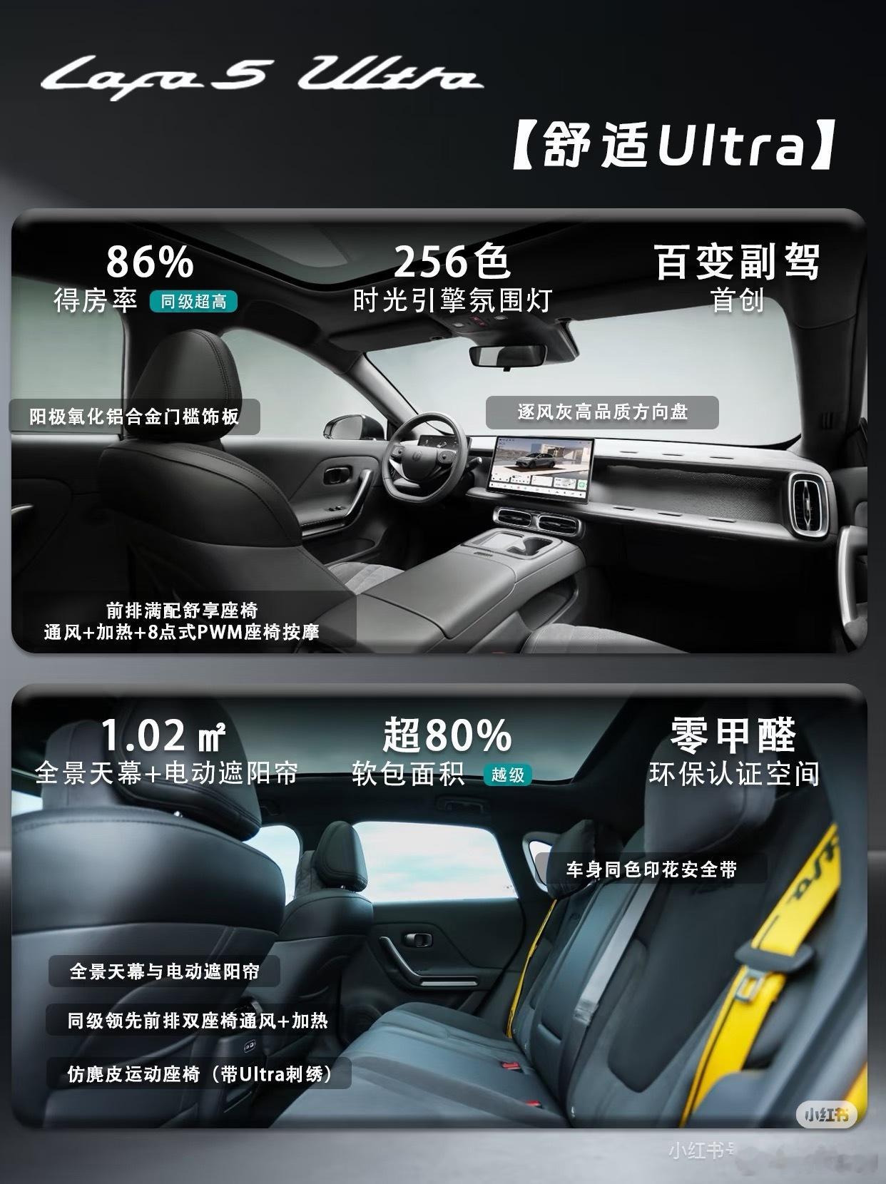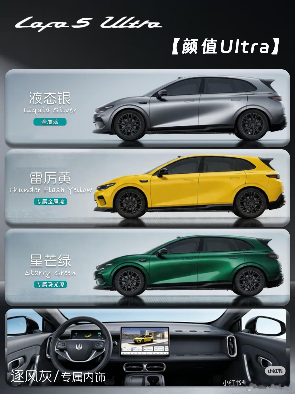 零跑Lafa5 Ultra正式登场,作为LAFA5车系的顶配版型,带来颜值、驾控、智能、舒适四大越级进阶。✨今日一图看懂帮你盘清楚,不同版本怎么选❓🚗颜值与舒适方面,全系Ultra标配原厂运动套件(破风前铲、风翼侧裙、驭风尾翼、扩散器)、19英寸枪灰轮毂+哑光深灰卡钳、全车黑化车标,以及雷厉黄/星芒绿/液态银三款新车色,战斗姿态出厂即巅峰💪。座舱内采用仿麂皮运动座椅(带Ultra刺绣)、前排8点式座椅按摩、车身同色印花安全带,兼顾极限驾控与日常舒适。🚗驾控与智能方面,180kW后驱电机带来5.9秒零百加速,中欧联合运动底盘调校(车身压低10mm、防倾杆强化、减振器低速阻尼提升15%),配合韩泰iON evo高性能鸳鸯胎(保时捷Taycan同款)和36.01m制动距离,ESP可全关,赛道乐趣拉满。🤖智能上,城市领航辅助(上市即开通)、8650芯片+激光雷达、360轮毂辅助视图,以及SA8295智舱+14.6英寸2.5K大屏+双AI大模型。🚗共享亮点方面,还拥有无框车门+纯平侧窗、三段式灯组、86%得房率、1.02㎡全景天幕+电动遮阳帘、零甲醛座舱等LAFA5全系高光配置。两个版本怎么选?⭐500Ultra适合追求极致推背感的玩家;⭐600Ultra,适合经常跨城自驾、希望减少充电频次的用户。所以,要快选500,要远选600。零跑Lafa5 Ultra,你会选哪款❓评论区聊聊~