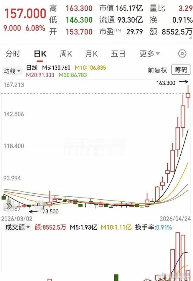 走势从70多块的位置突破后,拉升到如今的160块高空。在技术指标上,这属于典型的空翻多走势的单边上涨过程。在一些利好因素的刺激下,多头终于迎来了强势反击。在关键压力位被攻破以后,随即用一连串的大阳线冲了上去,走出了红三兵的多头进攻形态。很快走势就强势站稳了五日均线的上方,然后依附着五日线的支撑,走势在持续地向上攀爬飞升,走出来了一个又一个的阶段性新高的位置。有一说一,像这种突然起飞的走势,如果没有先知先觉的能力,是不太好提前抓住的。很多走势都是这样,因为一些机缘巧合突然就飞了上去。而对于这一类走势,只有等它走出了一个上升趋势以后,才能知道走势的迅猛上升走法。按照目前的上升逻辑来看,只要走势能够继续站在五日线的上方,同时量能处于一个温和状态,那么大概率可以延续在目前的上行通道当中。一旦在高位出现久攻不上、量价背离等滞涨现象时,就要留意走势可能会出现多转空了。