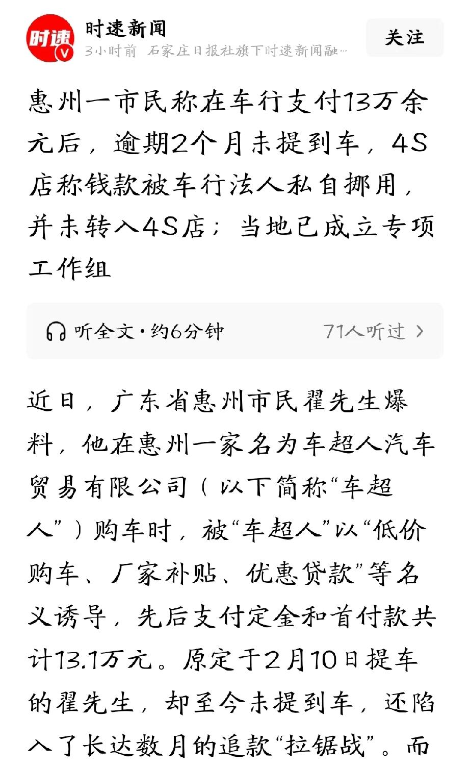 广东惠州,男子看了辆23万多车,朋友介绍他在一家车行购买,比4S店便宜大几千。他瞬间心动,当场支付了5千定金,事后又付了12.6万首付款。谁知,等男子高高兴兴去提车时,却发现老板失联了,他仔细一打听,才发现,钱被车行老板私自挪用,根本就没有向4S店打款。男子急疯了,赶紧报警,警方一调查,背后的问题惊呆众人。 今年1月份,翟先生因为生活和工作需要,打算买辆车,他精挑细选,在4S店看了一辆23万的车。 朋友得知后,给他介绍了一家店,说那家店有渠道,还是在4S店提车,但能便宜不老少钱,自己也是在这家车行买的,绝对靠谱。 翟先生想着是熟人介绍,应该不会有啥问题,就没太多顾虑。 1月26日,翟先生和父亲、介绍人一起去了这家车行,老板谌某热情表示,在他们这儿买车,能享受厂家补贴、置换补贴,还有低息贷款。 翟先生一听确实靠谱,他看中的那辆车一算,要比4S店的最低报价还便宜几千块。 这价格确实让人心动,他当天就付了5000元定金,签了购车合同,合同明确写着,2月10日准时提车。 1月28日,谌某又来找翟先生,让他赶紧把126000元的首付款打给自己,这样才能给4S店打款,好开发票、选车牌这些。 翟先生心想,合同都写得明明白白,又是熟人介绍的,应该没问题,就果断把钱转给了对方。 很快到了提车的日子,翟先生和家人兴高采烈地去车行提车,结果却傻了眼,转了一圈,压根见不着谌某的人影。 一开始,谌某说自己出去办事了,后来又找借口说4S店没给发票,反正就是不露面。 翟先生不放心,就跑去4S店打问,这才知道,谌某根本没把钱打过来,4S店催了好几次,他都找理由拖着。 他这才意识到,自己可能被骗了,赶紧报了警。 在警察的协调下,谌某口头答应春节前把钱退了,翟先生终于松了口气,可他没想到的是,过程并不顺利。 谌某军一次又一次承诺退款,但每次到了约定的日子,就说资金周转不开,过两天一定还。 后来,在多方协调下,谌某签了书面承诺书,按了手印,还录了像,保证3月6日前,把126000元的首付款和5000元的定金,一共131000元都退回来,还说会协商后续的费用。 可到了日子,谌某军一分钱没退,还彻底玩起了消失。 翟先生本来想着买辆车方便生活工作,结果却陷入了这样的麻烦里,他气炸了,就把此事曝光到了网上。 当地部门很快介入,一查才发现,被这家车行坑的不止他一个,光通过12345投诉的就有7宗,总金额85万多块。 当地政府成立了由政法、商务、市场监管、公安、法庭等多部门组成的专项工作组。 4月22号,工作组把谌某和翟先生叫到一起协调,谌某军当场转了3万1千块回来,说剩下的10万分5期还,月底再给1万。 翟先生心里还是没底,但好歹见到了回头钱,他一边准备材料打算打官司,一边继续盯着对方的承诺。 至于这家公司,已经被暂停了国家以旧换新补贴的资格,市场监督管理局也把它锁定,不能办变更、注销。 专项工作组还在继续跟进此事,督促该公司按时向消费者退款。 《民法典》第148条规定∶一方以欺诈手段,使对方在违背真实意思的情况下实施的民事法律行为,受欺诈方有权请求人民法院或者仲裁机构予以撤销。 谌某作为经营者,故意虚构厂家补贴、置换补贴、低息贷款及低价提车等虚假事实,并隐瞒其无实际履约能力、不会向4S店付款的真相,属于典型的欺诈行为。 翟先生因该欺诈陷入错误认识,支付13.1万元并签约,符合“违背真实意思”的要件。 据此,翟先生有权请求法院撤销购车合同,要求谌某全额返还13.1万元并赔偿资金占用利息等损失。