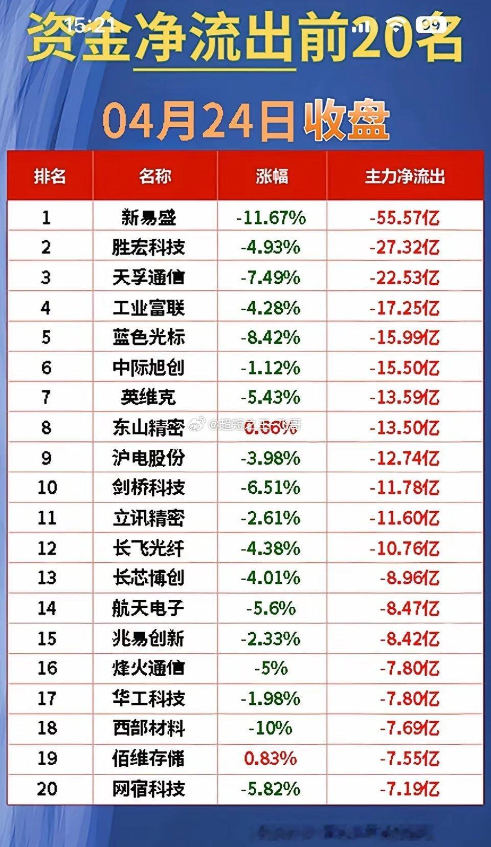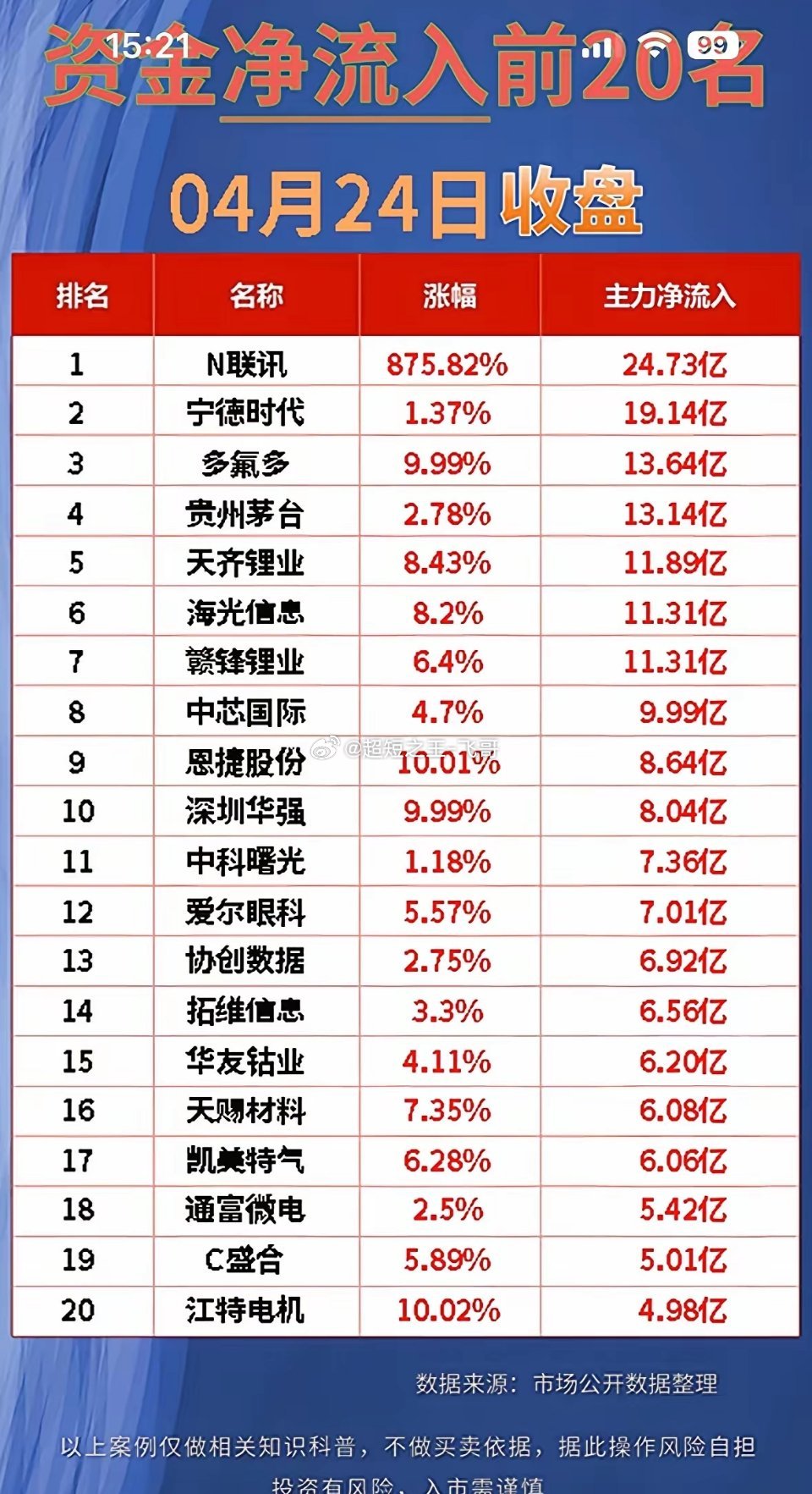 “4月24日净流入与净流出前20名股票,快来看看哪些涨得最多!”📈💰📈4月24日中午收盘,主力资金流向有不少看点。部分个股获大幅流入,成市场焦点。资金精准布局,既回补调整的细分赛道龙头,也青睐有事件催化预期的科技成长股,且这些个股“量价齐升”。从午盘资金流向看,有三大特征。“抢新”情绪高,N联讯吸金超21亿,占TOP20流入总额近四分之一。半导体国产替代“逆势吸金”,海光信息等上榜,资金从高位硬件向低位半导体设备与材料切换。新能源赛道“超跌反弹”,宁德时代等获大额流入。不过要注意,N联讯波动大,高位股有补跌风险,部分个股还得观察量能持续性。