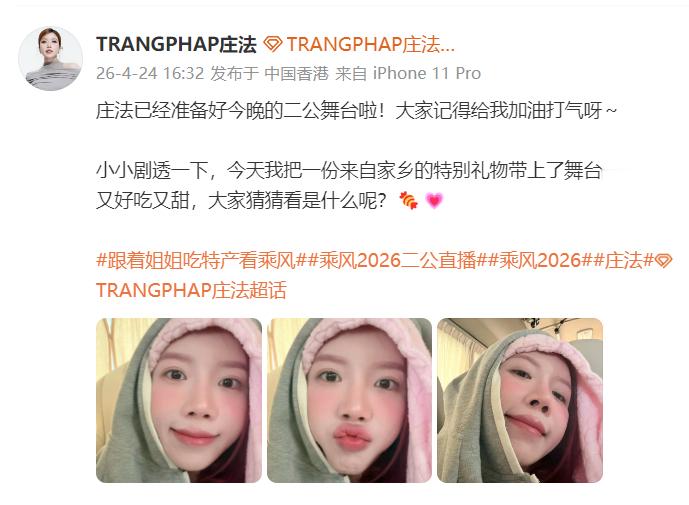 庄法自曝二公带家乡礼物庄法你看看你在干什么!三张萌萌的自拍就这样新鲜出炉了,脸蛋嫩的能掐出水,水汪汪的狗狗眼看着你,谁能不心动啊喂!姐姐还说晚上会带特产分享给我们,又甜又好吃,像姐姐一样甜~好期待姐姐的特产和二公舞台啊,急切等待中......乘风直播乘风2026