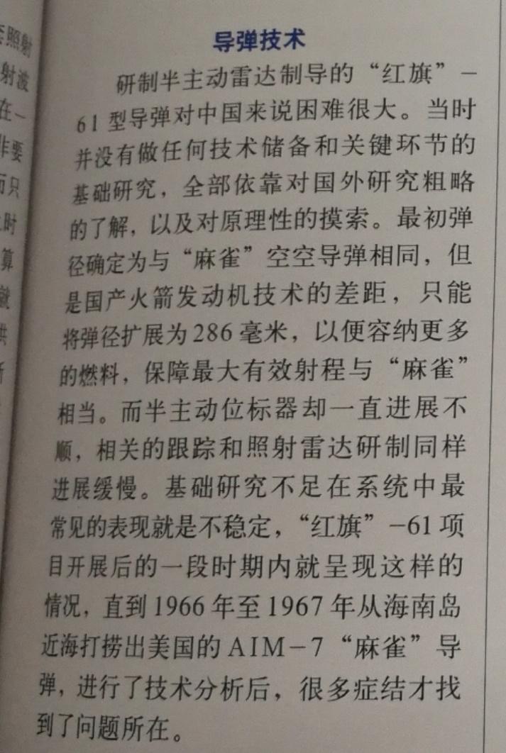 当年真不容易啊,红旗 - 61遭遇技术难题,后来捞到了美国的 AIM-7导弹才解决——HQ-61(红旗 - 61)是中国第一代自研中近程中低空防空导弹。 弹长 3.99 米、弹径 0.286 米、重 310 公斤,单级固体发动机,半主动雷达制导,射程 10 公里、射高 8 公里、速度 3 马赫,战斗部重 40 公斤。 该导弹研制始于 1965 年 8 月,最初为陆基地空导弹,定名红旗 - 41;1966 年 1 月更名红旗 - 61,列入国家计划。1967 年,因海军急需舰载防空导弹,改为舰空导弹,转由上海机电二局负责,配套 053K 型护卫舰。 不过,由于受文革冲击,科研秩序混乱,加上海上盐雾腐蚀、舰体摇摆稳定、空间狭小等技术难题,试验多次失败,1976 年首次海上发射受挫,后续又出现引信故障。后来,在南海捞到了美国的 AIM-7导弹(参见图4),拆解分析之后才找到了“病根”。 之后,红旗 - 61的研制进展加快,1986 年 12 月试验成功,1988 年 11 月设计定型,1992 年列装 053H2G 型护卫舰,陆基型同期定型。 HQ-61导弹的整个研制历时 23 年,虽性能定型时已不算先进,但填补了中国舰空导弹空白,为后续海红旗系列发展打下基础。