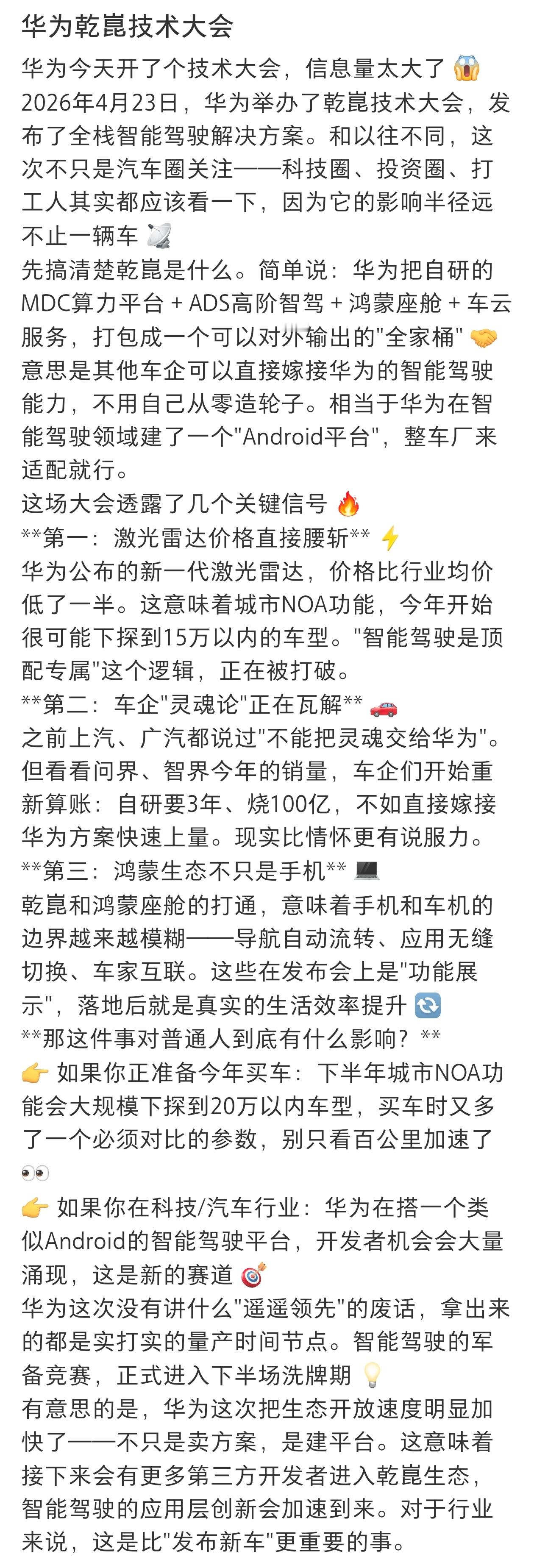 华为乾崑花180亿研究如何开得更好华为乾崑用真投入换真技术深耕底层研发,坚持长期主义。百亿级持续加码投入,专注攻克智能驾驶核心技术,以实打实的科研投入沉淀硬核实力,收获全行业认可!用心打磨出行体验,助力行业智能化加速前行~