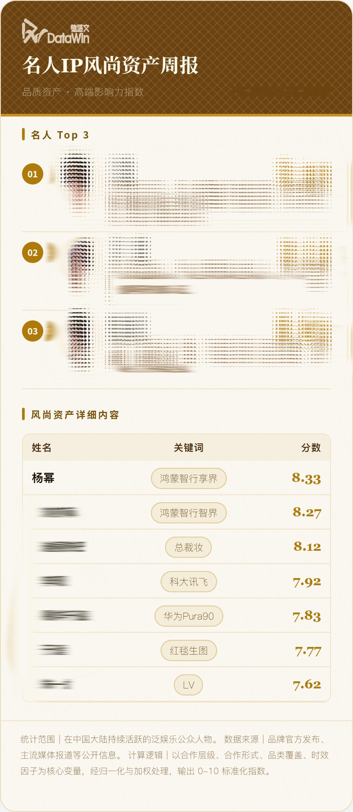 杨幂 本周德塔文名人IP风尚资产周报高端影响力指数中依然是上榜女星Top1 关键词是“鸿蒙智行享界”,不愧是华为高端豪华车系享界品牌代言人杨幂鸿蒙智行享界品牌代言人
