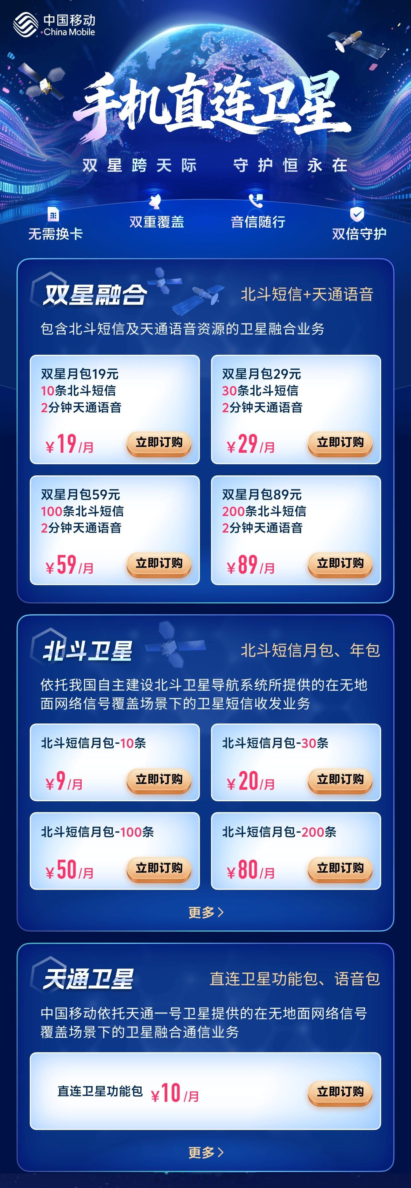 三大运营商的卫星通信服务加速了:之前是北斗卫星短信不再是移动的专属,联通也开始加入北斗卫星短信的服务。现在天通卫星通话也不再是电信的专属,移动也官宣正式开通了天通卫星电话服务,还公布了全新的双星融合(北斗短信+天通语音)套餐服务。