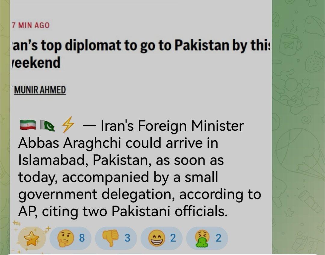 关于美伊谈判的最新消息。 据美国有线电视新闻网(CNN)援引巴基斯坦和伊朗消息人士的话报道,伊朗正派遣一个代表团前往巴基斯坦进行会谈。目前尚不清楚美国是否会参与其中。 据美联社援引两名巴基斯坦官员的话称,伊朗外交部长阿巴斯.阿拉格希可能最早于今日抵达巴基斯坦伊斯兰堡,并将率领一个小型政府代表团随行。 据路透社援引巴基斯坦政府消息人士的话称,伊朗外交部长阿巴斯·阿拉格奇预计将于周五晚间率领一个小型团队抵达伊斯兰堡,届时可能会与美国举行和平谈判。 美国的后勤和安保团队已经抵达伊斯兰堡,准备参与此次谈判。 半岛电视台:巴基斯坦政府消息人士证实,美伊双方在伊斯兰堡的谈判"极有可能取得突破"。由伊朗外交部长阿巴斯·阿拉格希率领的代表团预计将于今晚抵达。 阿拉格希此前与巴基斯坦副总理兼外交部长伊沙克·达尔进行了会谈,并与陆军参谋长阿西姆.穆尼尔进行了单独会谈﹣﹣不过巴基斯坦军方尚未确认后者会面一事。 本周早些时候,九架美军飞机抵达伊斯兰堡,运载通信设备、安保人员和技术人员。
