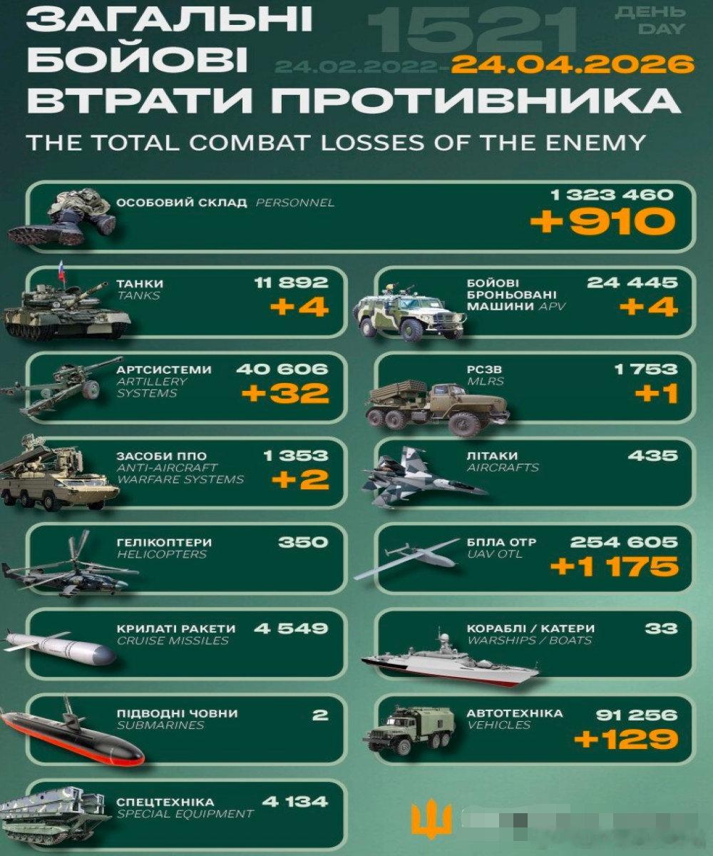 乌俄战争进入第1521天,乌克兰总参谋部发布战报:过去24小时俄军发动进攻97次,其中15次在胡利亚伊波列(9次在苏梅)、16次在康斯坦丁诺夫卡、6次在利曼、39次在波克罗夫斯克、12次在南顿涅茨克区域。毙伤俄910名。俄军累计损失1323460人。摧毁俄4辆坦克、4辆装甲车、32门火炮、1个火箭发射装置、2套防空系统、1175架大型无人机、129辆军车。