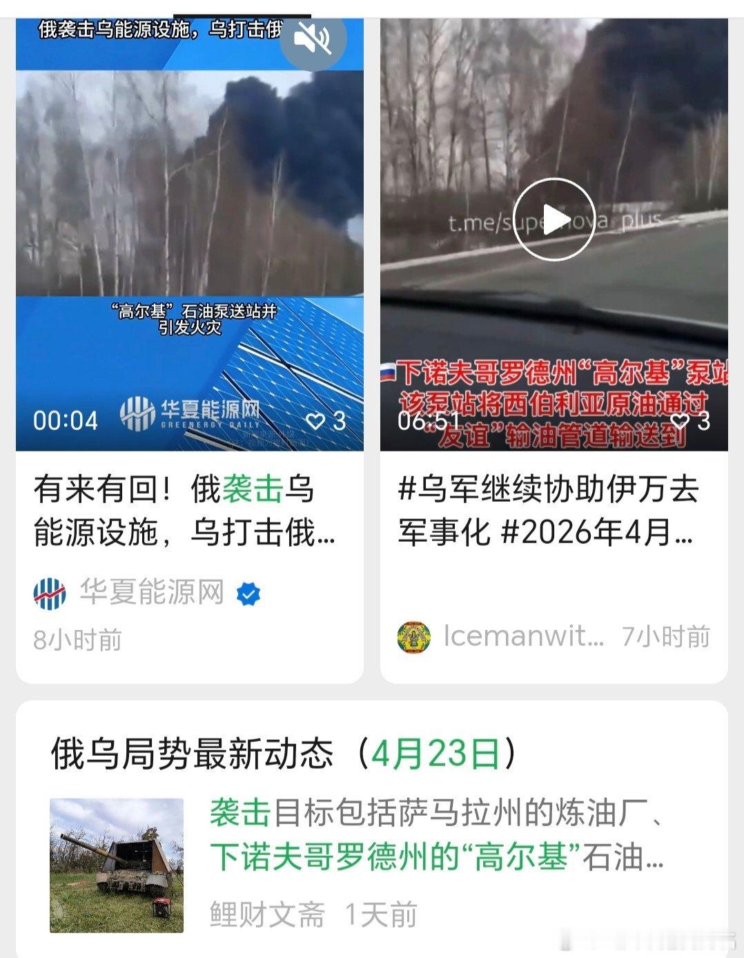 4月23日,乌无人机袭击萨马拉州新古比雪夫斯克市俄石油公司旗下炼油厂集团,导致部分储油罐起火,1处工业设施被毁,1死多伤。该袭击是乌近期对俄能源基础设施持续打击的一部分,该集团生产的燃料直接供应俄前线部队。这是该州炼油厂1周内第二次遇袭,此前4月18日2座炼油厂曾同时遭袭,造成产能严重受损。乌通过打击俄能源设施,削弱俄后勤补给能力。乌无人机当日凌晨还袭击了俄下诺夫哥罗德州的“高尔基”油泵站,引发超过2万平米的大火并损坏3个油库。该油泵站是俄国家石油管道运输公司的关键设施,负责转运原油至该州克斯托沃的卢克炼油厂,袭击导致俄境内石油供应物流受阻,直接影响俄预算收入。乌方称此次打击旨在削弱俄战争资金来源。