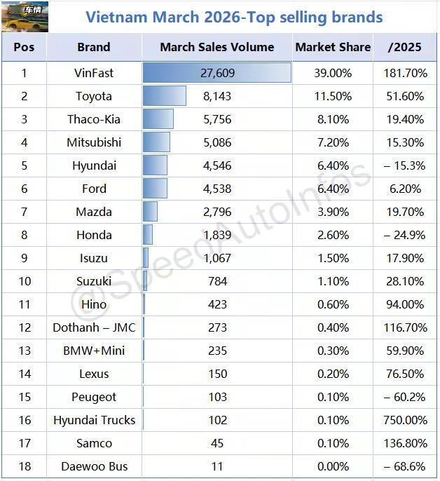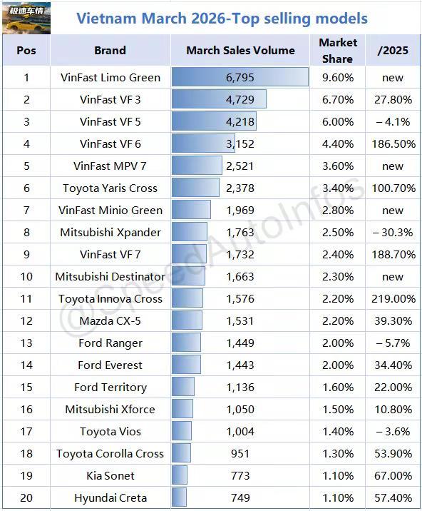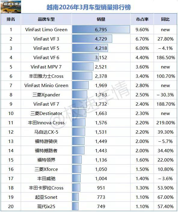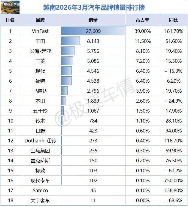 越南2026年3月汽车销量排行榜!3月,越南车市依旧由本土巨头Vinfast称霸!vinfast市占率高达39%,近乎垄断!极速车情 越南 vinfast 纯电车