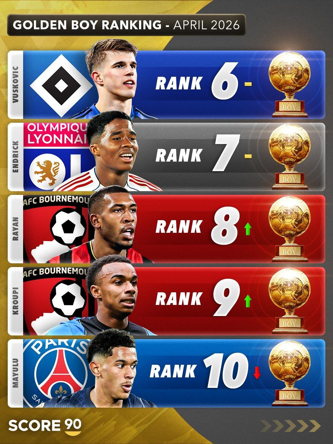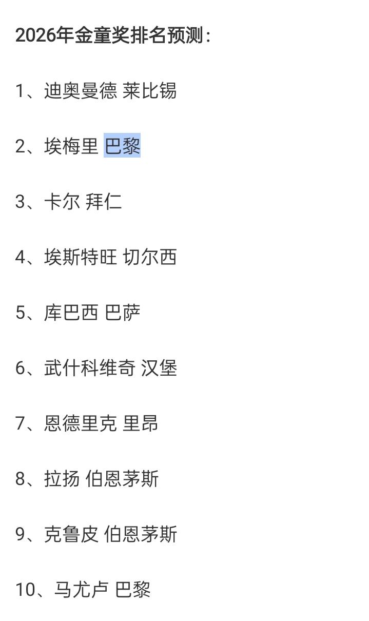 2026金童奖排名预测:迪奥曼德居首,埃梅里第二,巴黎、伯恩茅斯均2人进前十 04月24日, Score90预测2026年金童奖排名:迪奥曼德居首,埃梅里第二,卡尔第三,埃斯特旺第四,库巴西第五,马尤卢第10, 巴黎、伯恩茅斯均2人进前十