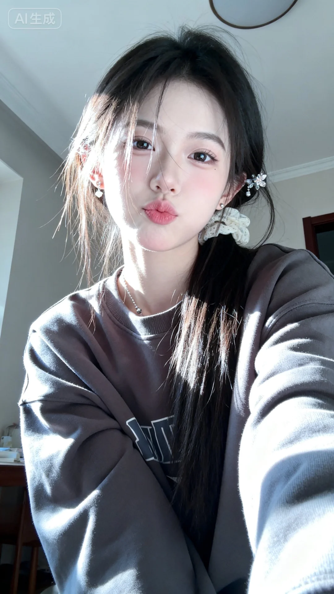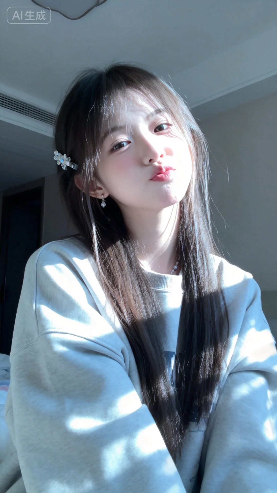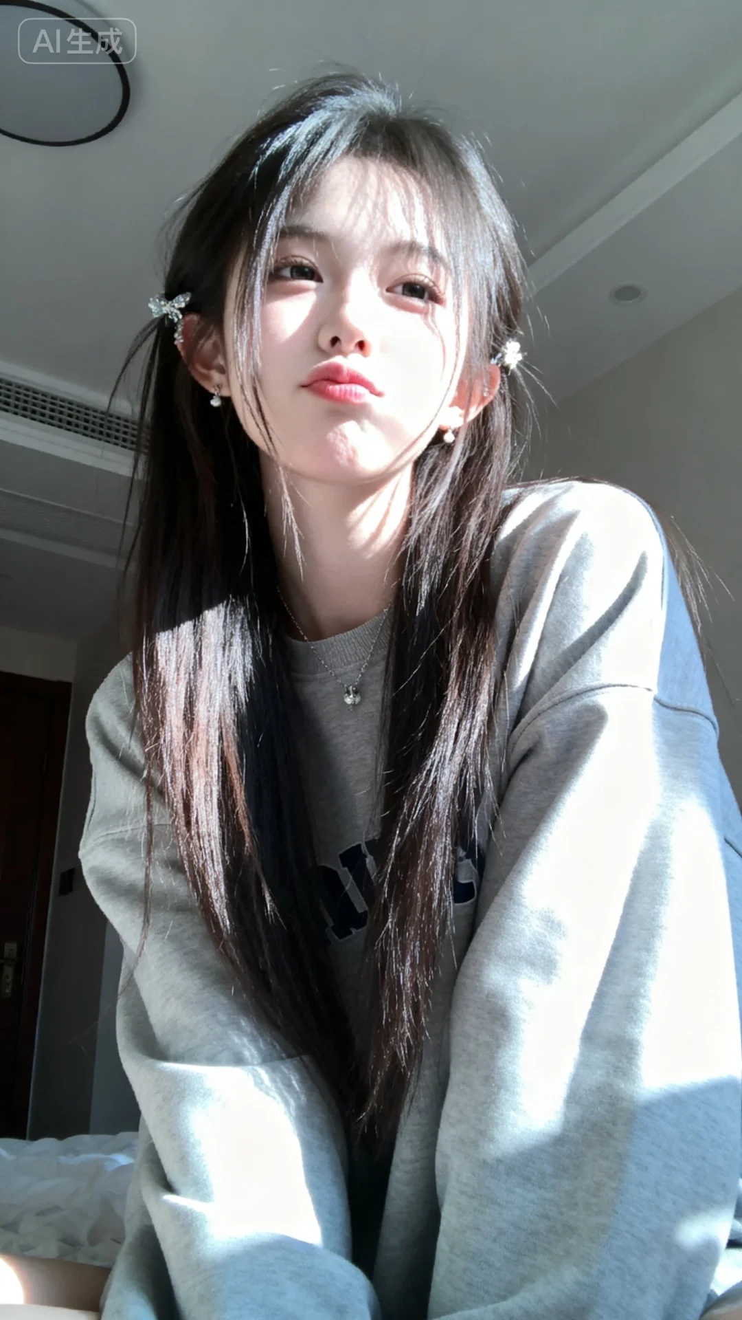 高清监控画面,高清分辨率,发丝垂坠且轻抚泛光,瓷感白肌肤,清纯动人,佩戴简约饰品,露出撇嘴的可爱俏皮娇俏微表情,楚楚可怜。画面聚焦面部,高曝低饱和,呈现生活快照般的随手一拍抓拍风格。中景,光影斑驳。清晰清楚干净画面,环境为大晴天,柔和的光线笼罩。阳光透过发丝照在脸上,突出冷白皮通透自然的肌肤状态,整体神态灵动又不失随性。唯美的氛围感。写实摄影风格,非商业修图,保留轻微的噪点,高光不过曝,阴影有细节,表情自然松弛慵懒休闲,眼神很自然不失真,呈现出慵懒松弛悠闲的状态感觉。氛围感,情绪片,CCD拍摄,大师作品。皮肤美白透亮,甜美氛围,独特韵味的美,人像摄影,画面中是一位身着长袖宽松大码卫衣、的可爱女生,有精致发饰,俏皮摆着pose,表情可爱,鬓角发丝凌乱垂落,展现慵懒感。普通房间背景,逆光、低角度仰拍,柔和光影勾勒轮廓,日常快照风格,微距半身镜头凸显冷白细腻皮肤与完美身材。