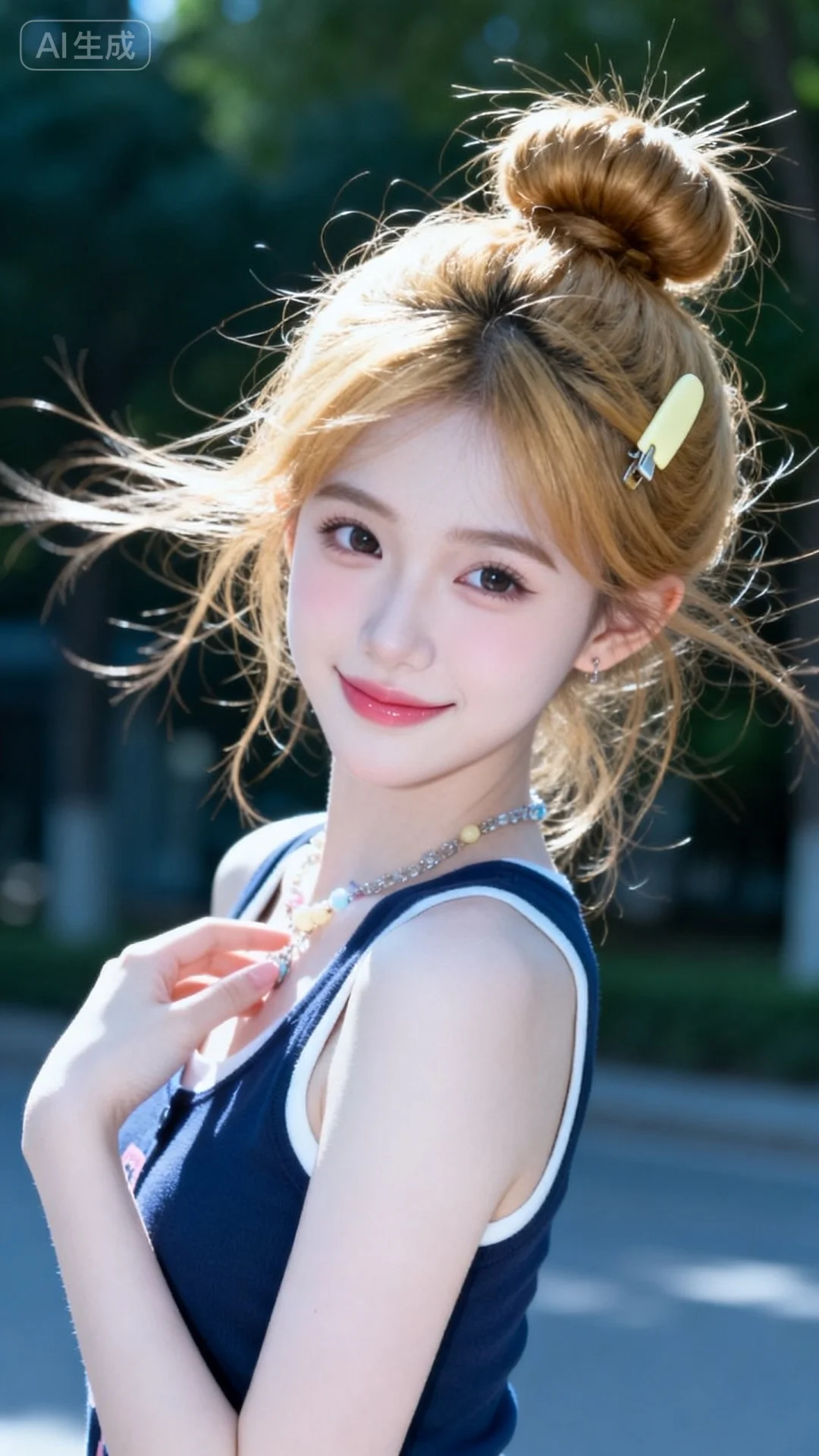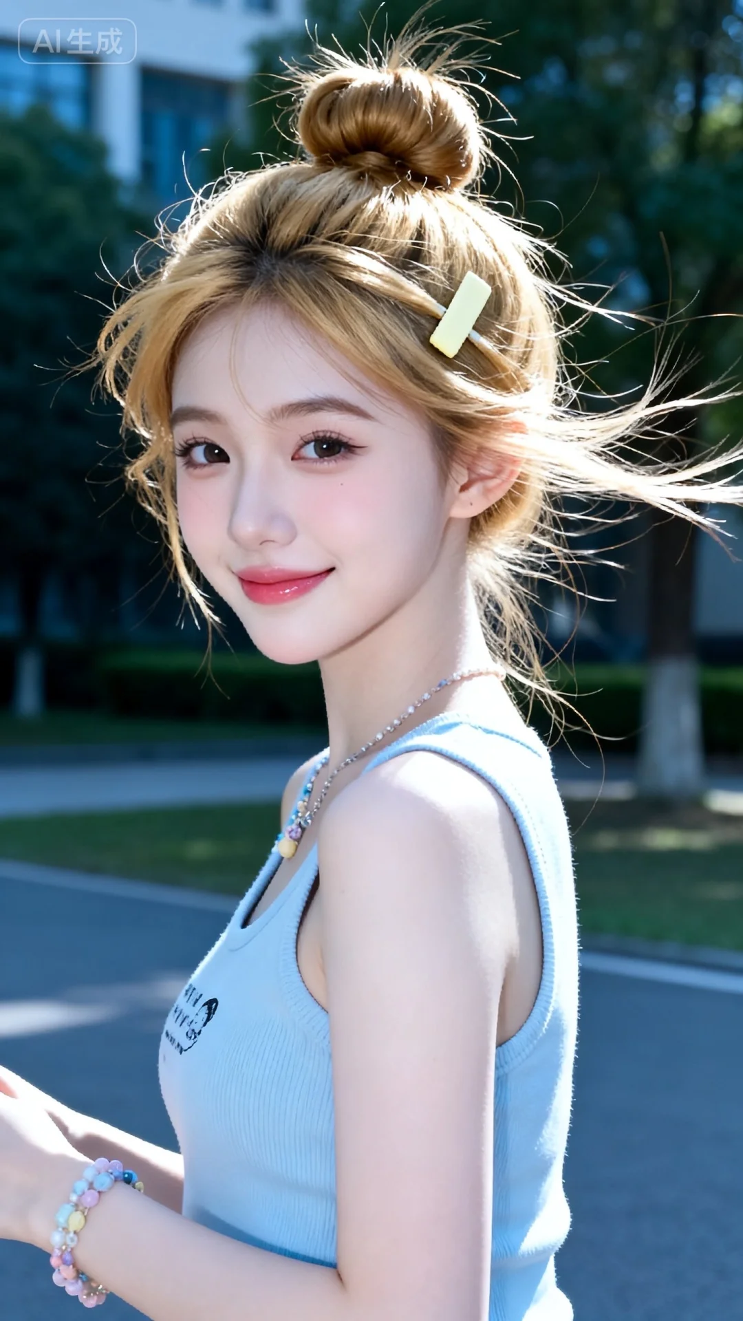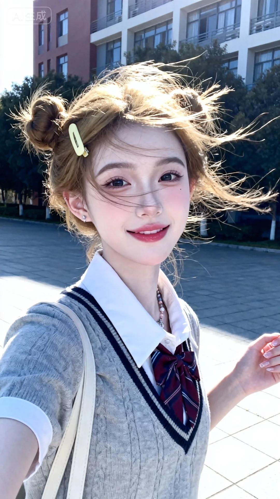 18岁女大学生在室外,尖下巴,三庭五眼比例均衡,身材娇小,娇羞可爱的随机表情,细腻陶瓷水嫩肌肤,偏冷白皮,随机的妆容,随机发型和颜色,随机的饰品,随机的动作,侧光,发丝轻飘,凌乱,随机角度拍摄,总体有很多的不确定性,但又好看,小众品牌穿搭,搭配又很合理,最高等级画质,真实合理,美颜全开。