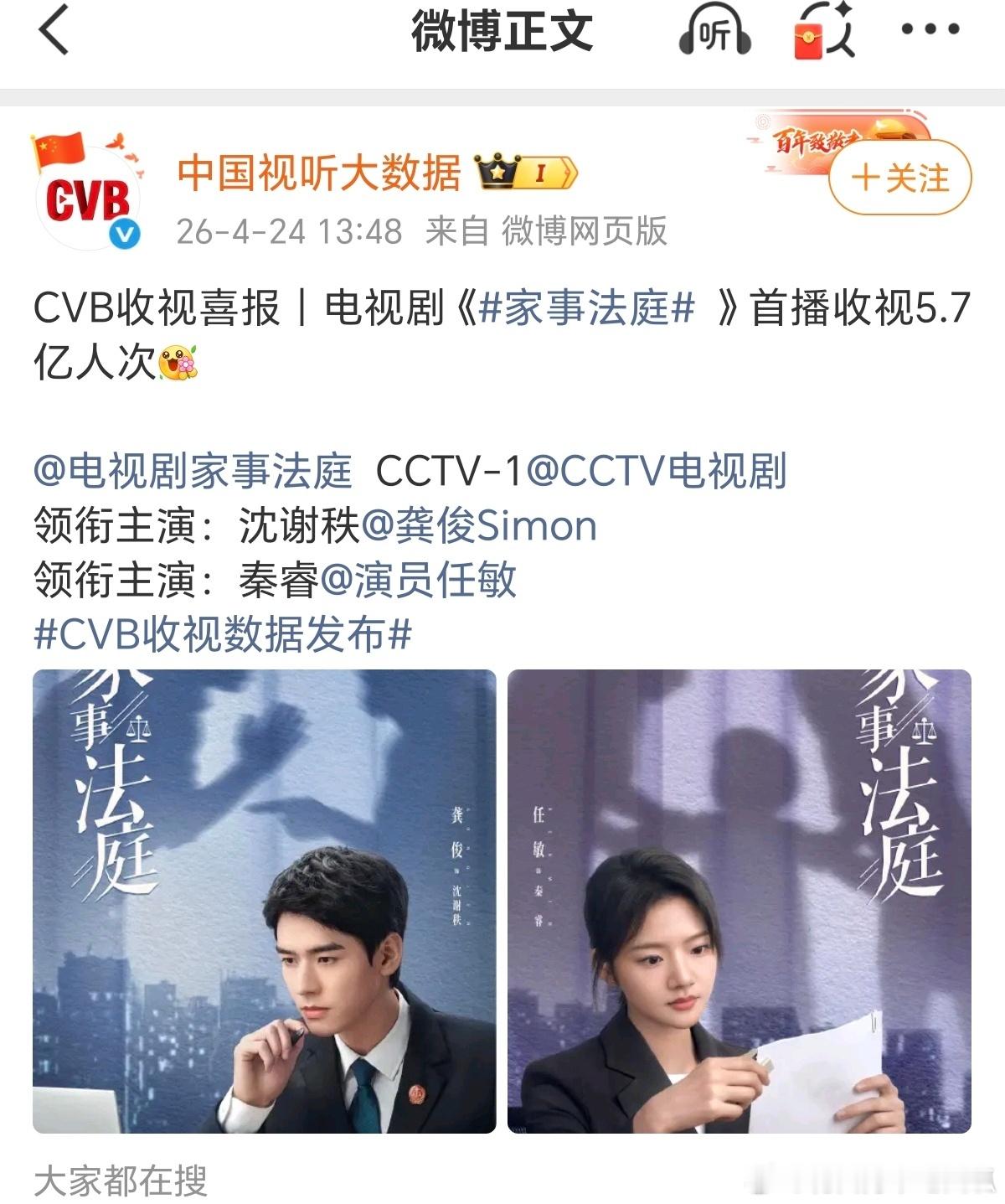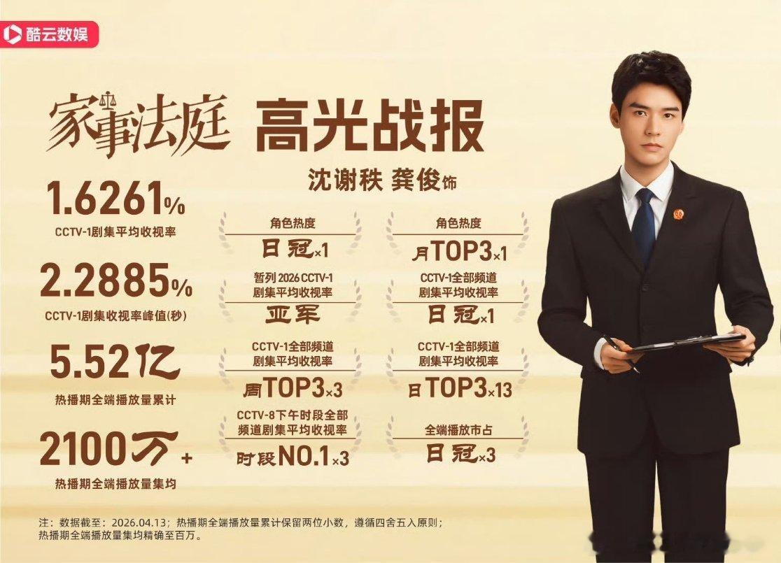 CVB认证《家事法庭》首播5.7亿人次,龚俊央一首秀法治剧就拿下口碑黑马,豆瓣评分从开分7.2一路涨到7.4,收视率也是同题材剧第一☝🏻️人民法院报还给《家事法庭》开了专版,很爽文的一个收官龚俊家事法庭首播收视5.7亿人次