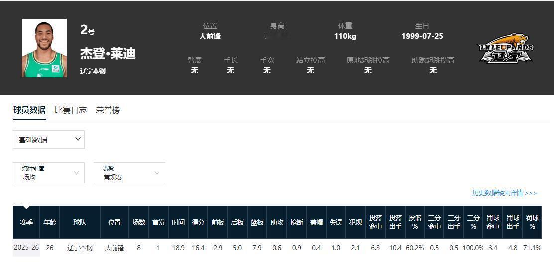 辽宁队今年唯一令人欣慰的是最后来的外援莱迪真不错,球技、人品、敬业精神都是上乘的,莱迪是4月5日来到辽宁队打的第一场比赛,截至今晚比赛结束一共打了八场比赛,场均上场时间18.9分钟,能够得到16.4分,7.9个篮板,0.6个助攻,0.5个抢断,投篮命中率60.2%,三分球命中率100%(4投4中),罚篮命中率71.1%,可以说表现非常出色。 最重要的是莱迪打球非常敬业,在场上不管发生什么情况都不会懈怠,打球兢兢业业,这一点比莫兰德强很多。辽宁队下个赛季一定会给莱迪上报优先续约权,如果莱迪上个赛季来就好了,当时辽宁队有大韩打5号位,莱迪第四节留在场上打4号位就太适合了。