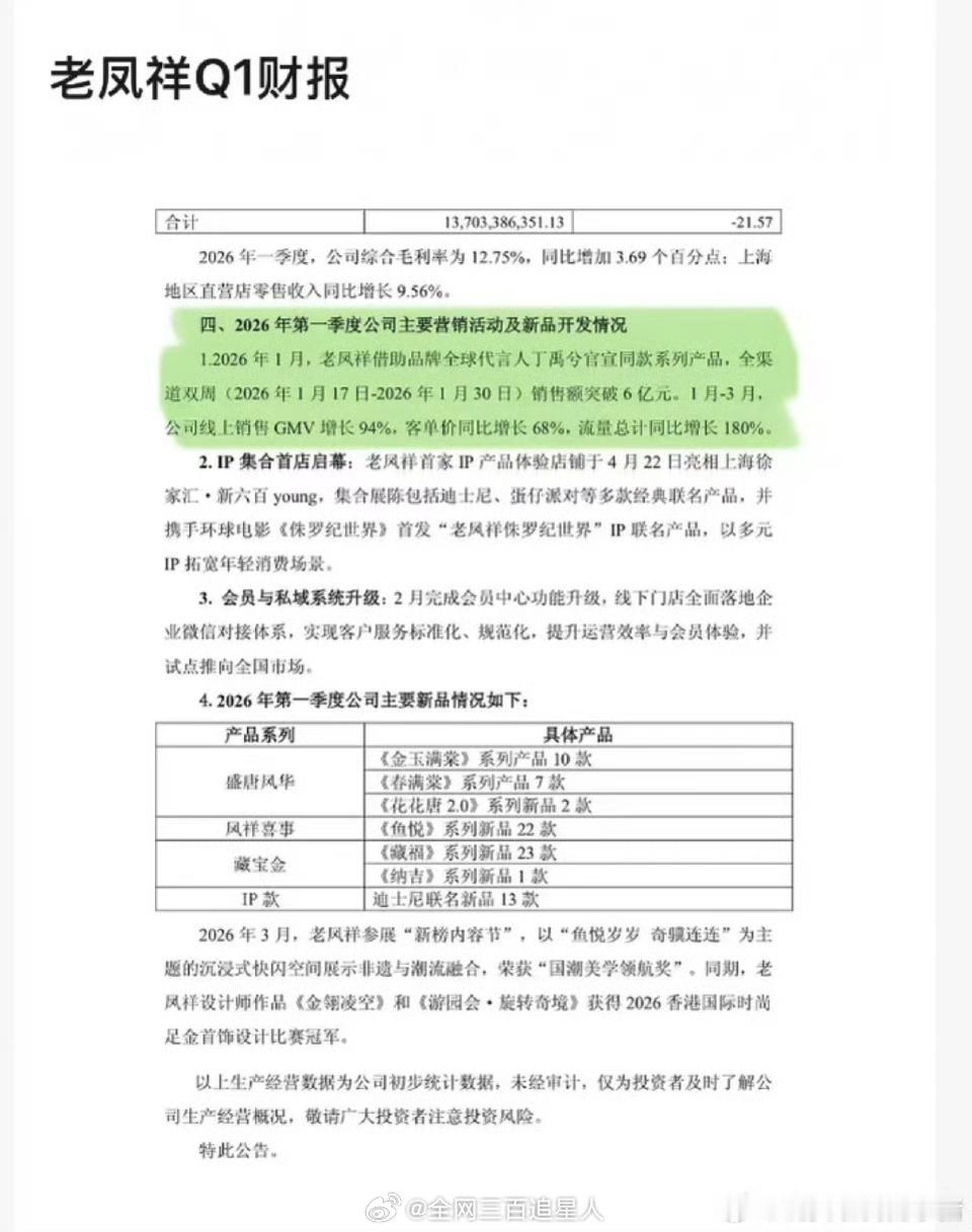 丁禹兮登上老凤祥公司Q1财报:“老凤祥借助品牌全球代言人丁禹兮官宣同款系列产品,全渠道双周(2026年1月17日﹣2026年1月30日)销售额突破6亿元。”👍