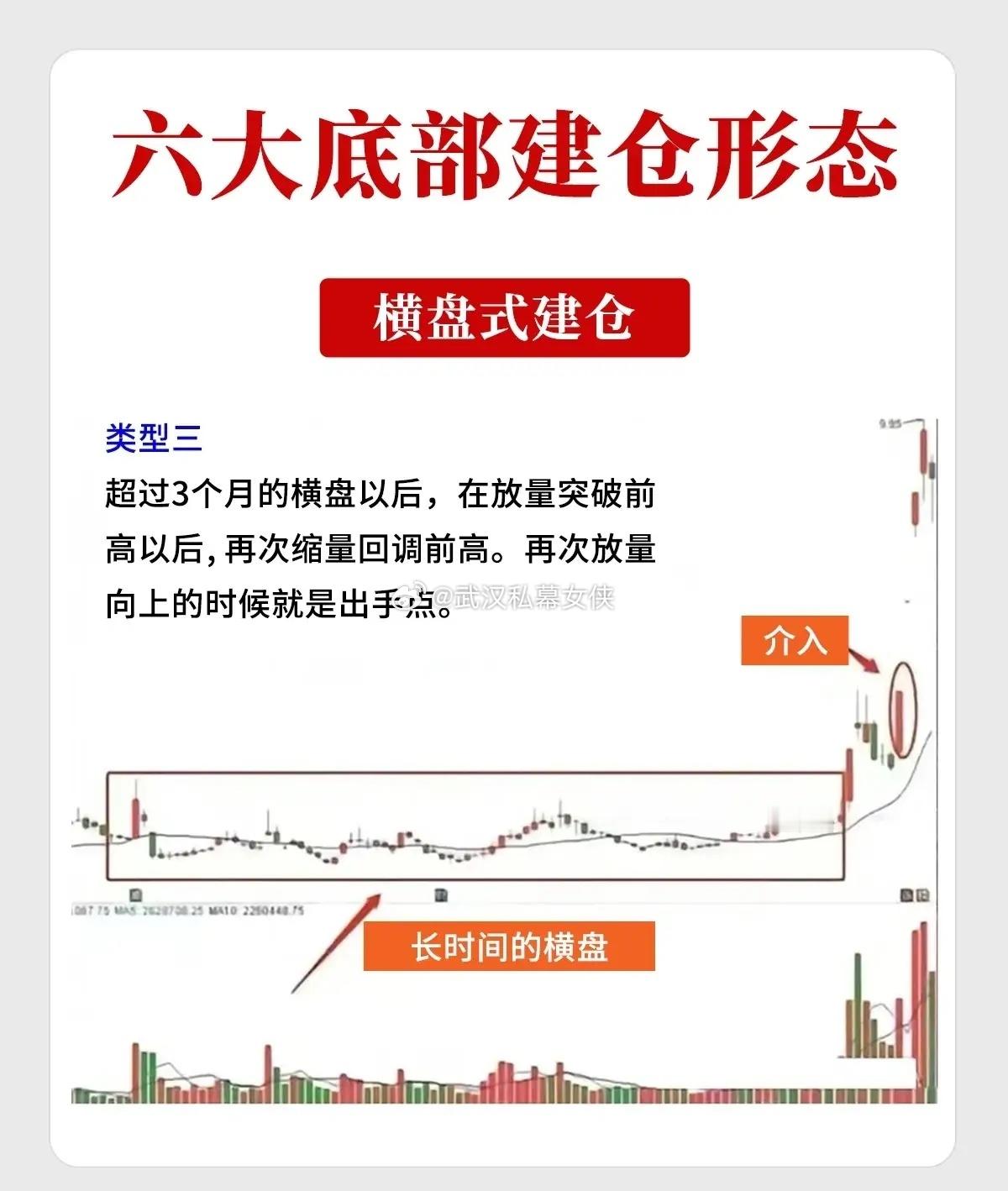 这六种形态是技术分析中关于主力资金在底部吸筹的经典图表模型。一、横盘式建仓形态