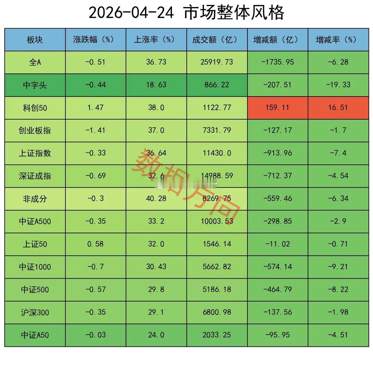 大盘全天弱势整理,全A指数跌幅0.51%,锂电池、半导体携手上涨,算力硬件方向回调明显,个股上涨率37%,成交额较昨天缩量6%。