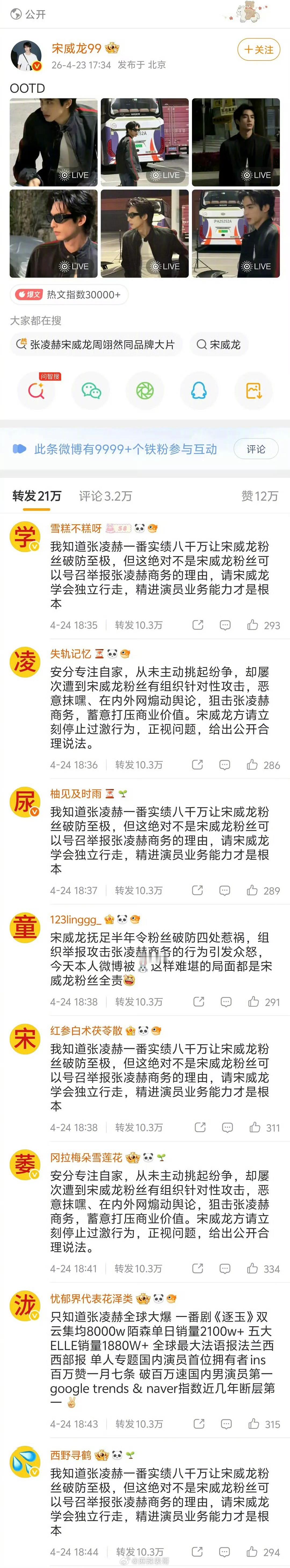 宋威龙张凌赫同品牌撞了同姿势后宋威龙的转发区已经没法看了