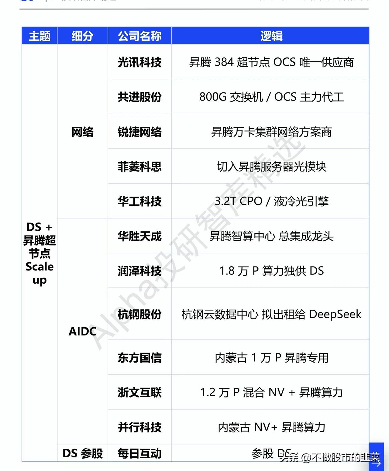 DeepSeek+昇腾超节点落地!国产算力ScaleUp产业链迎来爆发时刻 当DeepSeek与华为昇腾联手打造超节点集群,国产AI算力的ScaleUp之路正在迎来关键突破。这轮算力升级浪潮中,哪些环节才是真正吃到红利的核心玩家? 核心逻辑的关键,在于超节点集群对算力交付能力的极致要求。超大规模模型的训练与推理,不仅需要强大的单机算力,更依赖集群级的高速互联、液冷散热与高效集成,这直接带动了服务器、网络设备、数据中心全产业链的需求爆发。 服务器环节,作为超节点集群的核心载体,龙头企业率先受益。高新发展作为昇腾第一大代工方,拓维信息凭借30%-40%的昇腾整机市占率,神州数码凭借“分销+整机”双龙头优势,华勤科技提供整机柜+交换机+液冷全栈方案,共同支撑起超节点集群的硬件交付。 网络设备是决定集群性能的关键。光讯科技作为昇腾384超节点OCS唯一供应商,共进股份、锐捷网络提供高速交换机与万卡集群网络方案,菲菱科思、华工科技切入光模块与CPO领域,保障集群间的低延迟高带宽通信。 AIDC数据中心环节,算力的落地场景正在快速扩容。润泽科技为DeepSeek独供1.8万P算力,杭钢股份、东方国信、浙文互联等企业通过新建或改造数据中心,提供昇腾算力专属服务,并行科技则提供混合算力支持,满足超节点集群的部署需求。 此外,供应链环节的华丰科技、兴森科技提供高速背板与ABF载板,芯片分销环节的深圳华强、力源信息保障芯片供给,共同构建起完整的超节点ScaleUp产业链。 从服务器整机到高速互联,再到数据中心交付,DeepSeek与昇腾的超节点合作,正在重构国产算力的产业格局。随着超节点集群的持续落地,产业链各环节的龙头企业,都将迎来确定性的成长机遇。 注:以上内容基于公开资料整理,不构成任何投资建议