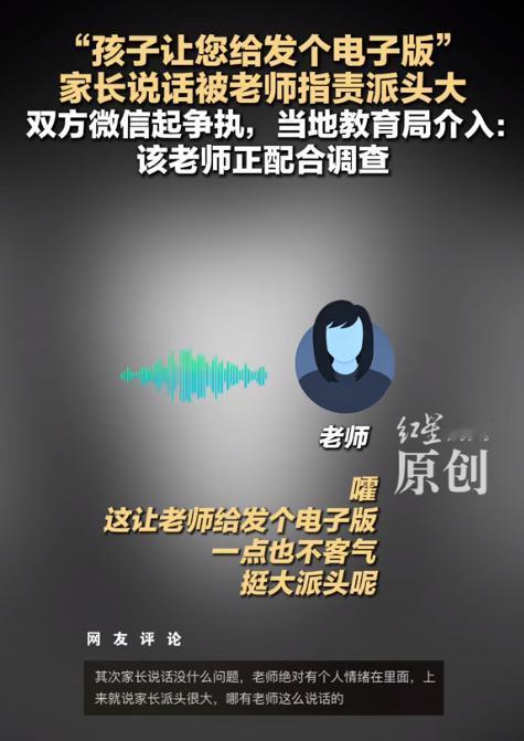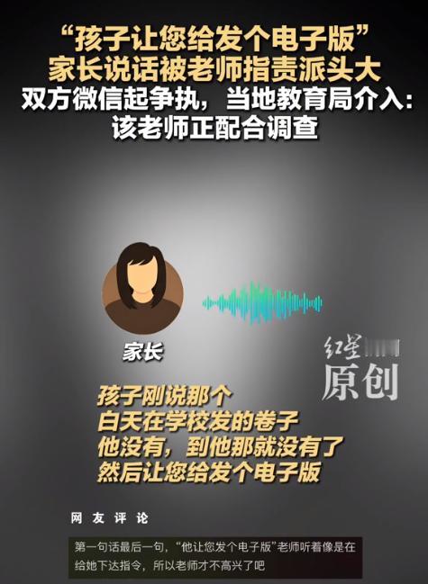 “是谁派头大?”天津,一位家长在晚上7点发语音向老师求试卷电子版,称自家孩子白天未领到。可老师却怒斥家长“派头大”、“不懂客气”,甚至还质问家长是不是把老师当服务员了。 家长见老师有误会,立即解释是学校漏发了,可老师却没好气地怼了一句“下班了”。家长被这一顿指责激起了火气,认为老师才是真的“派头大”,随即将聊天记录打包投诉,事情迅速闹大。 谁能想到,这起冲突的起因竟是一个老实孩子的“至暗时刻”。事发当天,小明眼睁睁看着试卷发到自己这儿刚好断了档,讲台上的老师早已转身离开,留给小明一个无法言说的尴尬背影。 孩子回家后满脸委屈,当妈的看在眼里疼在心里,想着不能耽误复习。于是,她尽量客气地给老师发去一条语音,解释孩子没领到纸质版,询问是否能发一个电子档方便自行打印。 本是一次正常的家校沟通,却像捅了马蜂窝。 语音发出去没两分钟,老师的回复条像连珠炮一样弹了出来,每一句都带着刺骨的嫌恶。 “要东西连句客气话都没有吗?”“你把老师当服务人员了吗?”“我已经下班了,真没有电子版!”老师这几句话,直接把家校沟通的桥梁给炸飞了。 在这位老师看来,下班时间就是神圣不可侵犯的领地,哪怕这失误源自她漏发试卷的疏忽,哪怕转发一个文件只要几秒。她把维护尊严的方式,变成了一种近乎刻薄的权利示威。 家长这边也懵了,话语里用了“您”,态度也算温和,怎么就成了老师口中那个“耍派头”的罪人?这种不分青红皂白的指责,让原本想息事宁人的家长彻底寒了心。 事情的发展极其迅速,家长的投诉并非石沉大海。根据《教师法》及相关职业道德准则,教师应尊重学生人格,不指责、训斥家长,言行必须规范健康。 目前的处理结果是:涉事老师已被暂停授课,正接受全面调查。 这个结果让不少网友直呼“硬气”,但也引发了关于“教师下班权”与“职业责任感”的激烈争论。 要知道,家长的“下班”往往只是换了个地方上班,他们在辅导作业、对接老师时,同样牺牲了休息时间。如果老师将分内工作的补救视作“当服务员”,这不仅是职业精神的缺失,更是共情能力的崩塌。 真正的教师尊严,绝不是靠在群里呵斥家长、宣示“下班主权”换来的。它藏在深夜备课的台灯下,藏在对每一个漏洞的负责里。 教育如果失去了温度,剩下的只有冷冰冰的对立。 这张小小的试卷不仅考出了学生的成绩,更像一面照妖镜,照出了某些教育者背后扭曲的职业心态和匮乏的担当意识。