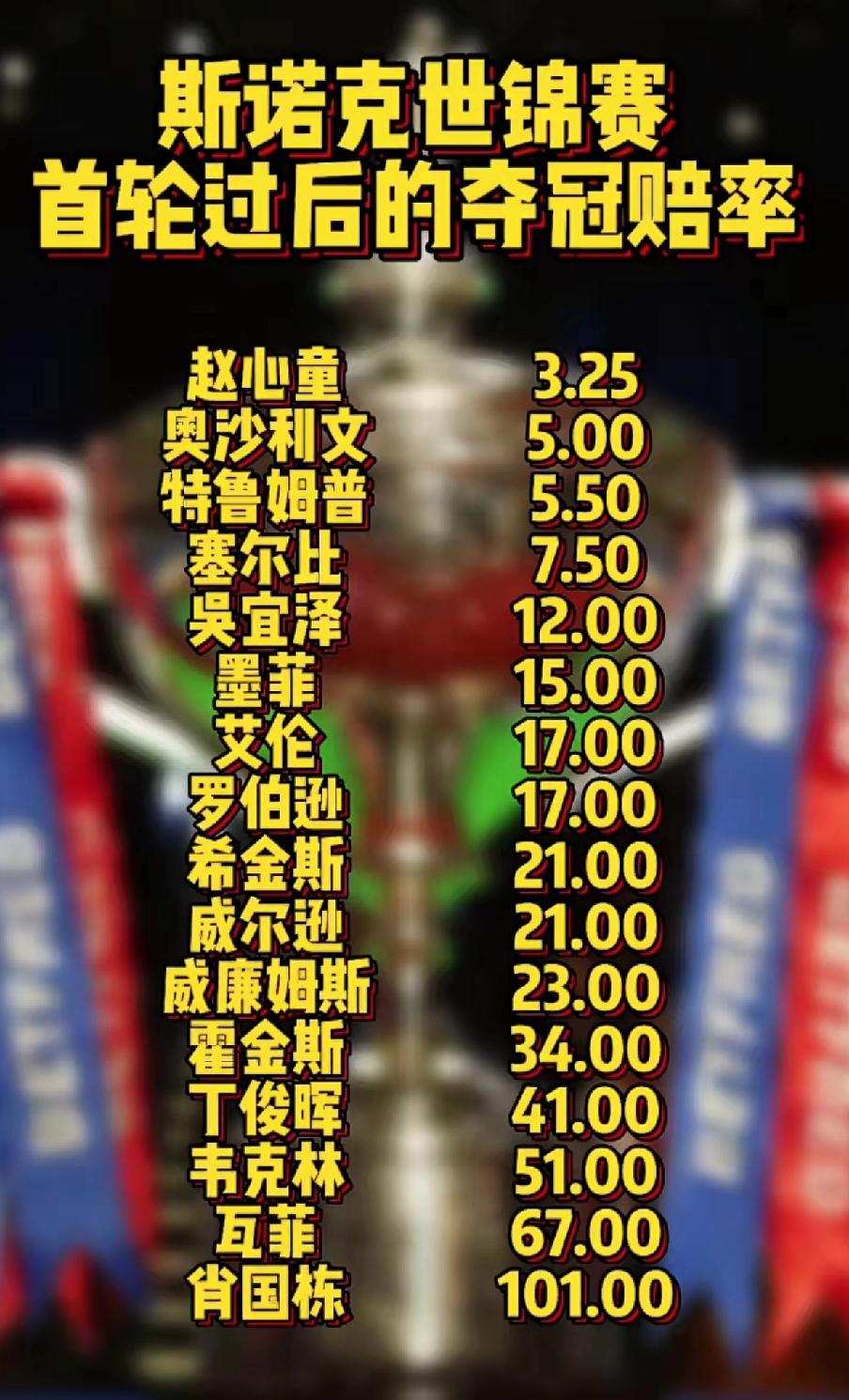 2026斯诺克世锦赛正赛首轮落幕后,最新球员夺冠概率一览表 斯诺克世界锦标赛16强选手已经全部产生,我国一共有4位选手晋级。 目前根据首轮表现,统计出了16强最新夺冠概率。 最有希望夺冠的选手依然是卫冕冠军赵心童,我国斯诺克一哥丁俊晖夺冠概率排在第13位。 下面来看看最新夺冠概率一览表:
