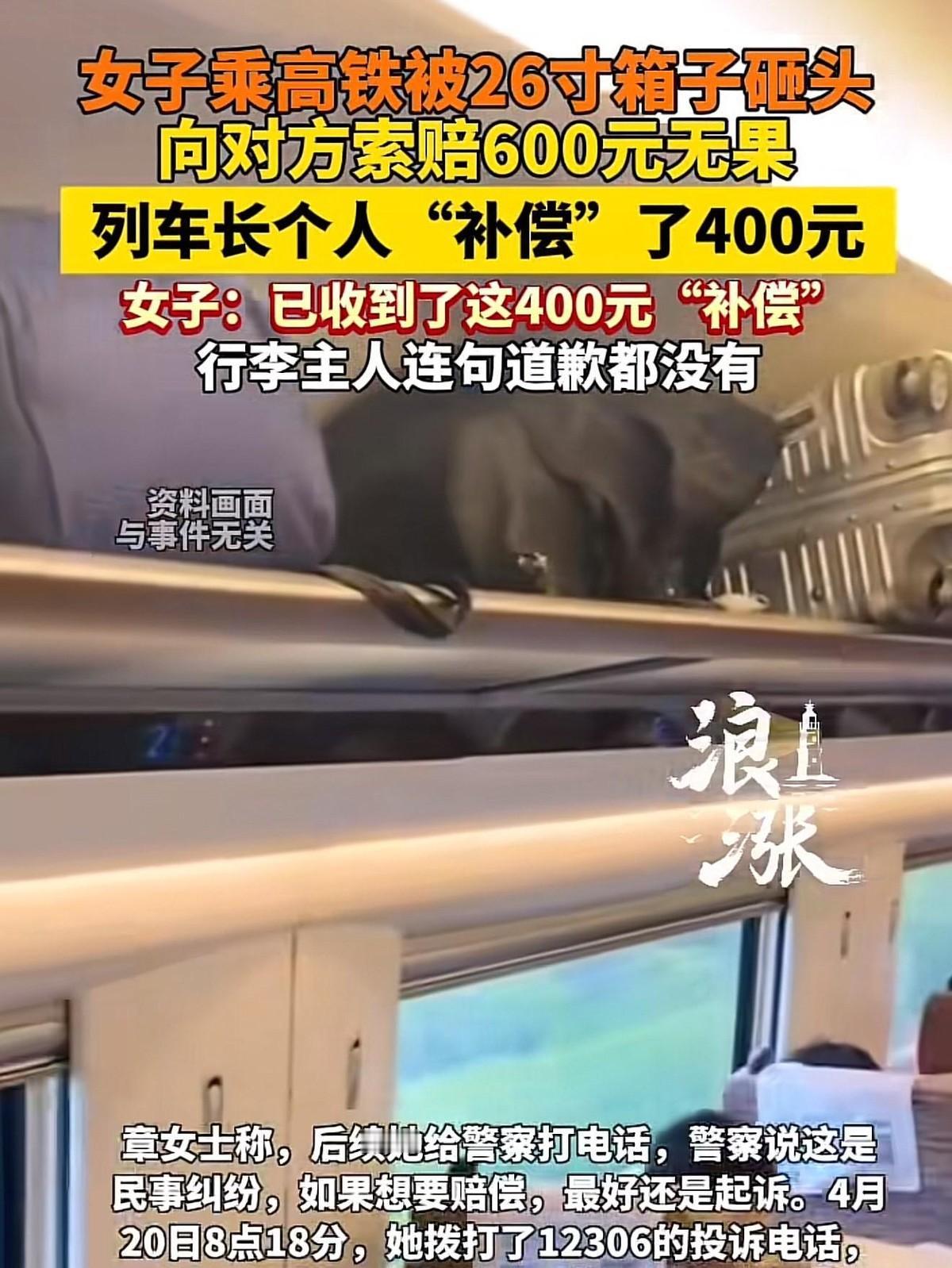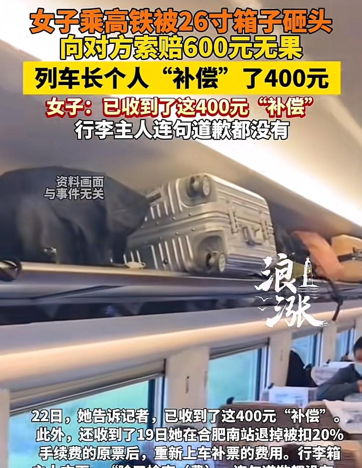 坐高铁出门,你以为买的是一张通往诗和远方的车票,谁能想到头顶上可能悬着一颗随时引爆的“定时炸弹”? 一个重达几十斤的26寸巨型行李箱毫无征兆地砸中女大学生脑袋,肇事者不仅拒绝赔偿剩余损失,还叫嚣着“有本事找铁路局”,态度简直狂到了骨子里。 结果你猜怎么着?最后掏出真金白银息事宁人的,竟然是这趟列车毫不相干的列车长,这出连环戏,真是把人性的底色扒得一干二净。 事情发生在4月19日。南京的章同学拿到了D3069次列车的车票,满心欢喜地奔赴汉口。 对于一个手头紧巴巴的大学生来说,这趟旅程可是从牙缝里省下生活费才成行的。 她落座在15D位置,刚把随身背包塞进座椅下方,正准备靠在椅背上歇口气,意外就这么猝不及防地砸了下来。 隔壁15A座位的杜某,此前随手将一个足足26寸的大号行李箱塞进了头顶的置物架。 列车驶离站台不到二十分钟,这坨庞然大物突然失去重心,带着风声“砰”地一声,结结实实砸在章同学的天灵盖上。 女孩只觉得脑子里“嗡”的一声巨响,剧痛瞬间撕裂头皮,眼泪根本控制不住地往外涌,双眼迅速肿胀充血。 听到车厢里的痛呼声,列车员不仅立刻拉响广播寻找医护人员,还火速协调两人在最近的合肥南站中断行程,紧急下车就医。 到了急诊科,杜某起初倒是利索,当场扫码付了20元挂号费,外加210元的脑部CT检查费。 经过一个多小时的焦灼等待,影像片子洗出来了:万幸,没有出现颅骨骨裂,属于软组织挫伤。 听到主治医师下定论的那一刻,悬在众人心口的大石头总算落了地。 因为被迫中断行程滞留合肥,章同学预订的汉口住宿、景区门票全打了水漂,加上滞留产生的交通和餐饮支出,满打满算损失了近600元。 杜某的逻辑极其“硬气”:我不跑不溜,该付的检查费也付了,顶多再给你100块,别得寸进尺! 他甚至反咬一口,认定600元里包含的车票损失不该由自己承担,直言行李架是铁路局的,箱子掉下来铁路局也有份,让章同学直接找列车方算账。 丢下这番话,他连一句最起码的“对不起”都没施舍,干脆利落地转身走人。 章同学果断拨通了报警电话,可警方给出的答复却让人倍感无奈:这属于典型民事纠纷,公安机关没有执法权强制划扣资金,唯一的维权路径是去人民法院提起诉讼。 对于一个涉世未深的外地大学生来说,为区区几百块钱耗费大把时间和精力去打官司,这道门槛实在太高了。 就在章同学求告无门、倍感憋屈的时候,事情却迎来了四两拨千斤的神转折。 仅仅过了两个多小时,那趟D3069次列车的列车长主动打来电话。 这位列车长不仅走后台流程协调退还了全部车票手续费,还以个人名义掏出腰包,直接转账400元作为补偿,彻底了结了这桩麻烦事。 捏着这笔本不该由列车长承担的钱,再对比那个连句道歉都吝啬的肇事者,真是让人唏嘘不已。 翻开《民法典》第一千一百六十五条,白纸黑字写得清清楚楚:行为人因过错侵害他人民事权益造成损害的,应当承担侵权责任。 你把超规格的26寸巨物塞进行李架却没有固定稳妥,这就是板上钉钉的过错,按法律赔偿被砸者的合理行程损失,简直天经地义。 人性的悲哀就在于,总有人把别人的善良当成自己耍无赖的筹码,把推卸责任包装成一种精明。 这次是列车长自掏腰包兜了底,保全了铁路部门的体面,也用真情温暖了一个受尽委屈的姑娘。 但法治社会的底层逻辑绝不该是“按闹分配”,更不该让老实人次次吃哑巴亏。 出门在外,防人之心不可无。咱们普通人遇到类似飞来横祸,第一时间拍照录像固定现场证据,捏紧每一张医疗发票,才是保护自己最硬气的底牌!