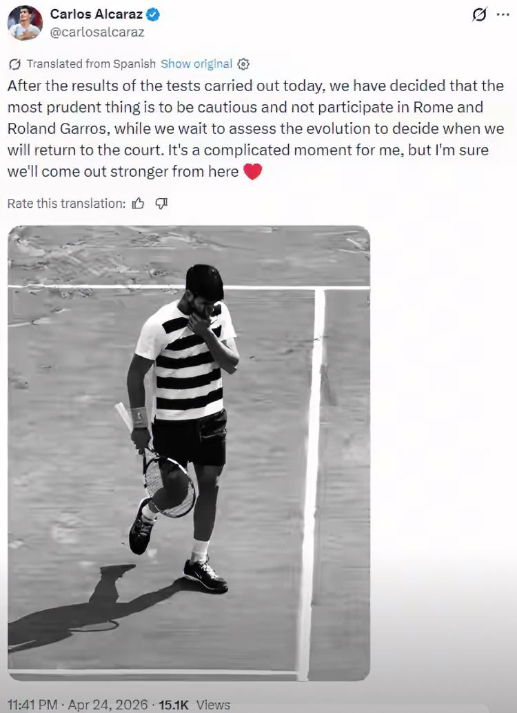 退赛!! 大师赛退!! 大满贯退!! 巴塞罗那站是厄运的起点!!阿尔卡拉斯赶打巴塞罗那500赛付出的代价太大了…、阿卡发文:因为右手伤势比想象中的要严重…..马德里大师赛退了、接下来的罗马大师赛也要退、更惨的是连法网都无法参加,希望阿卡早日康复吧!! 但不得不说,少了阿尔卡拉斯的法网,让更多的球员看到夺冠的希望,特别是擅长打红土的球员,哈哈,大家觉得谁最有可能法网登顶呢?辛纳?还是德约?或是其他人?阿尔卡拉斯