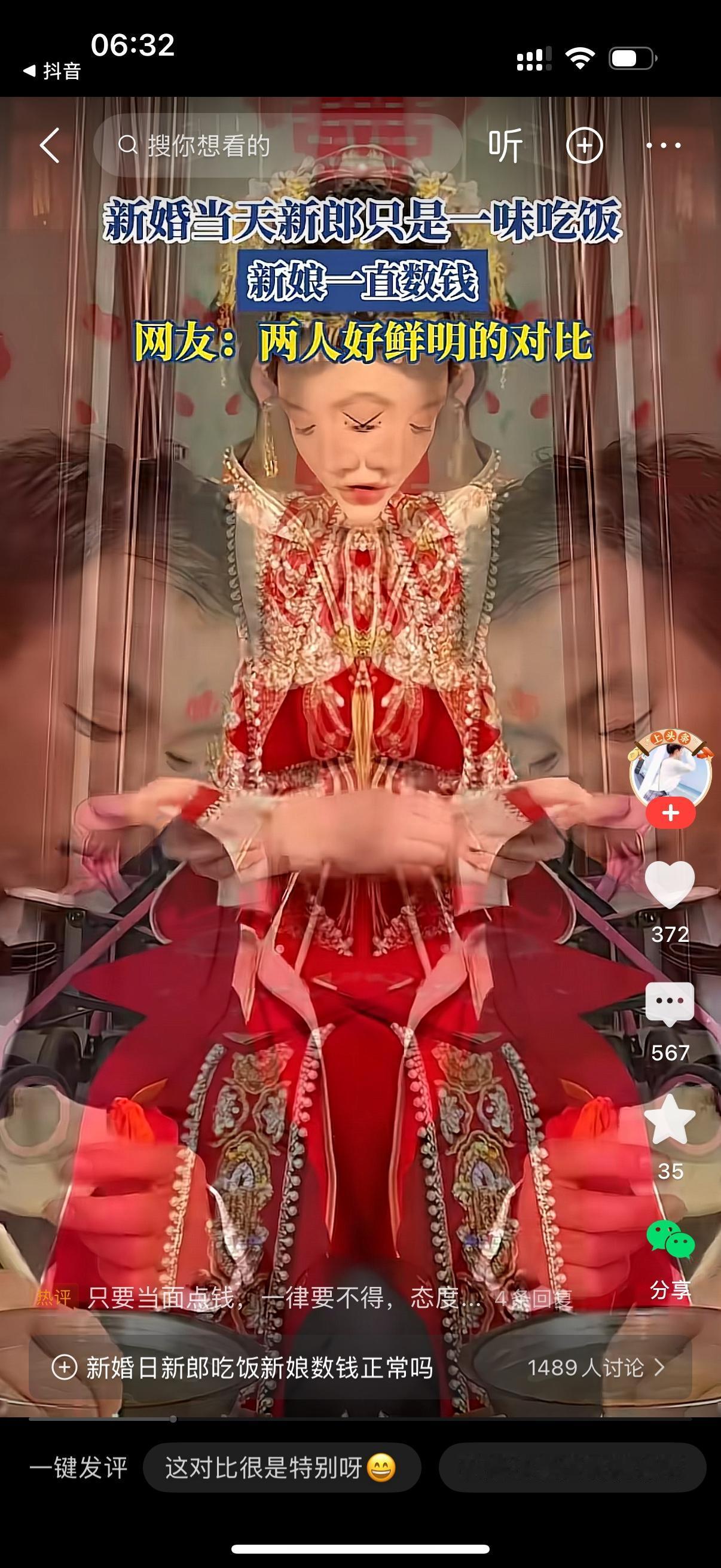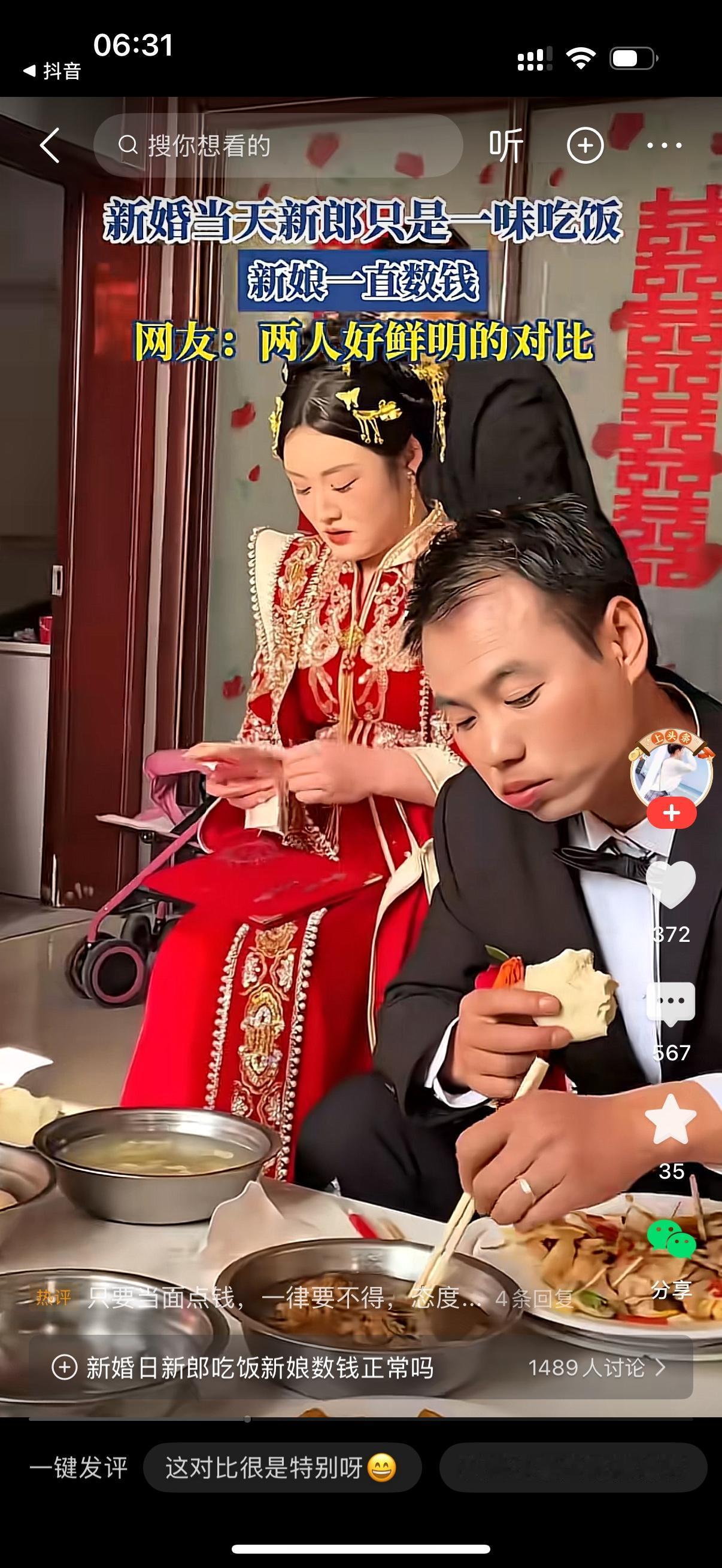 新婚当天,新郎坐着一味地吃饭,新娘一直在数钱。新娘数钱那个认真,那个一丝不苟,数了一遍又一遍。新郎都感觉很无奈,心想你是嫁给我还是嫁给钱啊?不用说,这种女人千万不要娶,娶回去也是倒霉,太爱钱了。这种女人和你没有真爱,她只爱钱。哪一天你没钱了,她肯定离开你。
