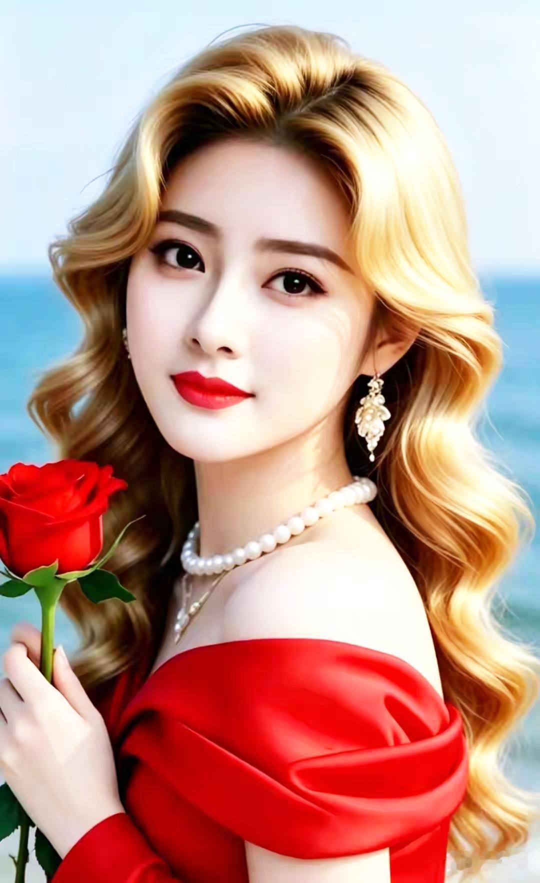 红玫瑰与金发美人,浪漫海边的优雅瞬间